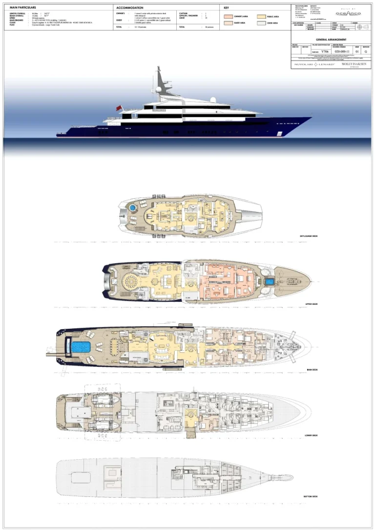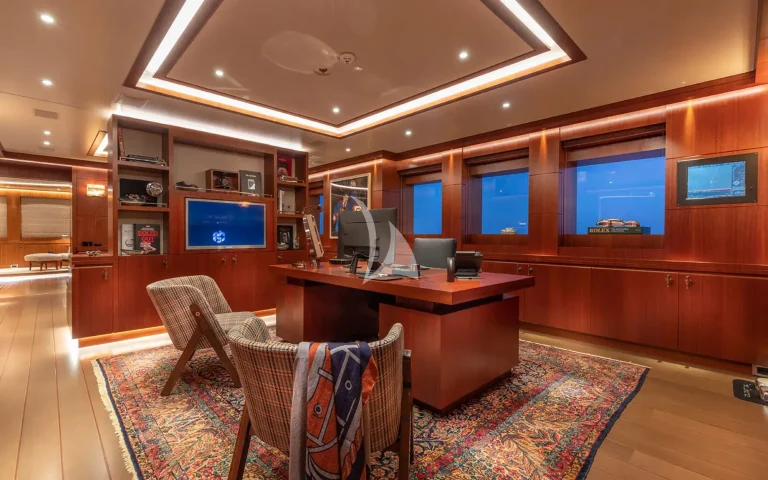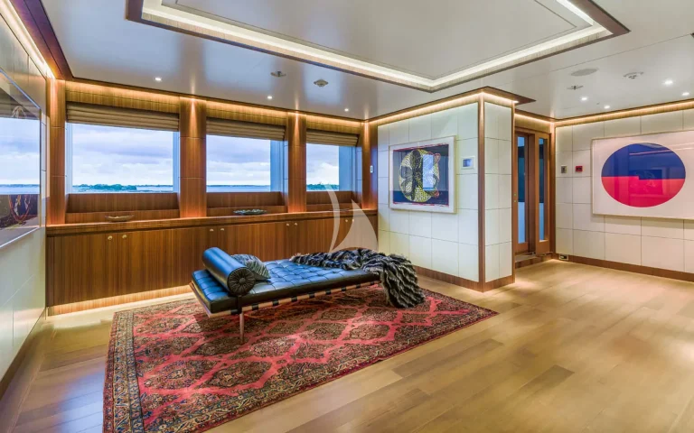The Owner’s suite provides for exceptional privacy. An exquisite entryway presents as a small gallery of art dotting the walls leading up to a beautiful wooden etched sideboard service station. Once the oversized doors open, this leads first into the large office featuring a separate lounge with Queen convertible sofa and TV, ensuite with full bathroom and stunning blue mosaic tile shower. This can be privatized from the Owner’s suite and wardrobe or opened up as one oversized suite. Furthest forward in the Owner’s bedroom are two small seating areas to starboard and forward, split level from the central Kind size bed. Aft of this is a sizeable combined his and her bathroom with private toilet/bidet, 2 sinks, large stall shower and jacuzzi tub. Veering off the bathroom and bedroom is a passive entry into an enormously impressive dressing room which can host several ladies who enjoy getting ready together. A port side door provides access to the Owner’s pool deck; a cozy place for an intimate group at cocktail hour or personal early morning dip. The open deck forward of this can be used for themed evenings under the stars for dinner, dancing and alternative entertainment.