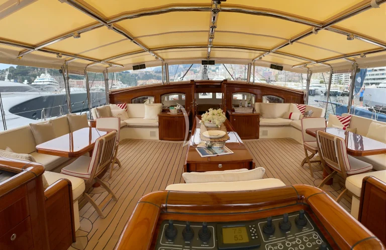Aft of the deckhouse is the large covered cockpit with cushioned seating and drink tables inside and additional seating outside of the cockpit. This spacious area is also used for dining on deck and can accommodate a large table and chairs for 10 guests.
