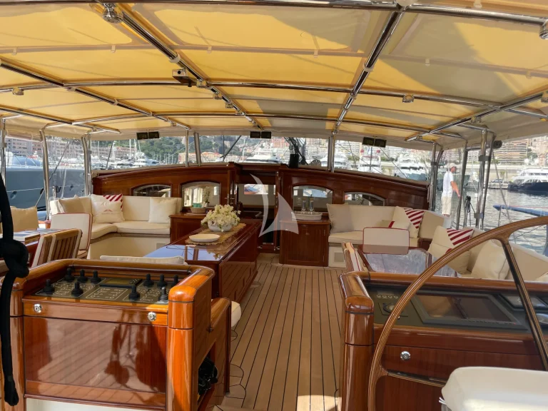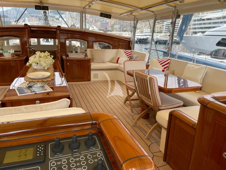 Between the cockpit and the Owners’ deckhouse is the helm station with two steering positions and controls for the winches and the hydraulics.