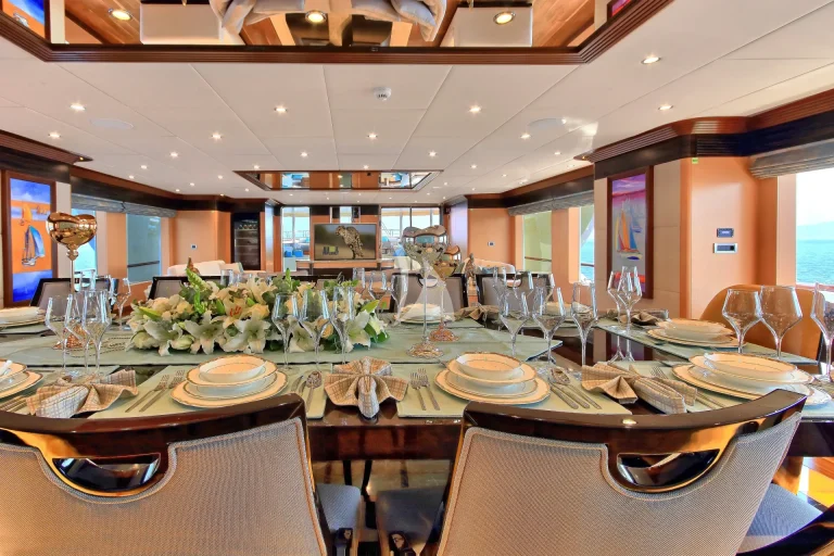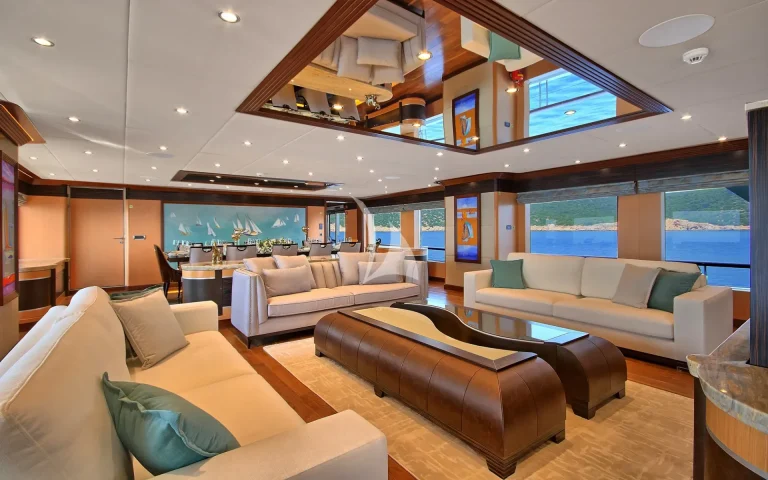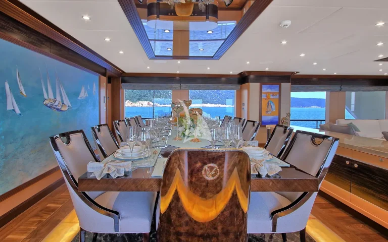 The main saloon is located on the main deck and affords ample spaces both in closed area and open area with dining table, chairs and sofas. It’s gracefully designed with ebony and Aningeria, which are combined with leather and marble and produced specially for MS MEIRA. The most up to date technological equipment are available on board as, automation and entertainment system, which can control air condition, curtains, lights, entertainment system (TV& Custom music system).