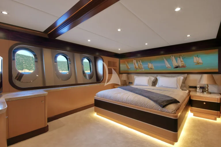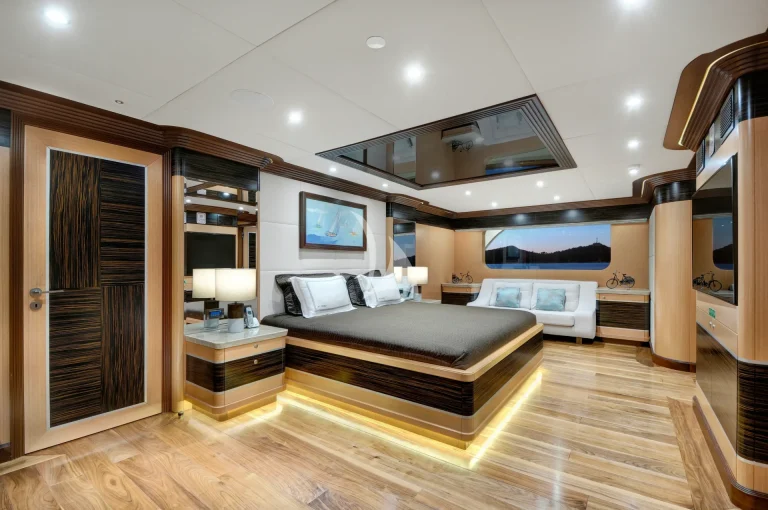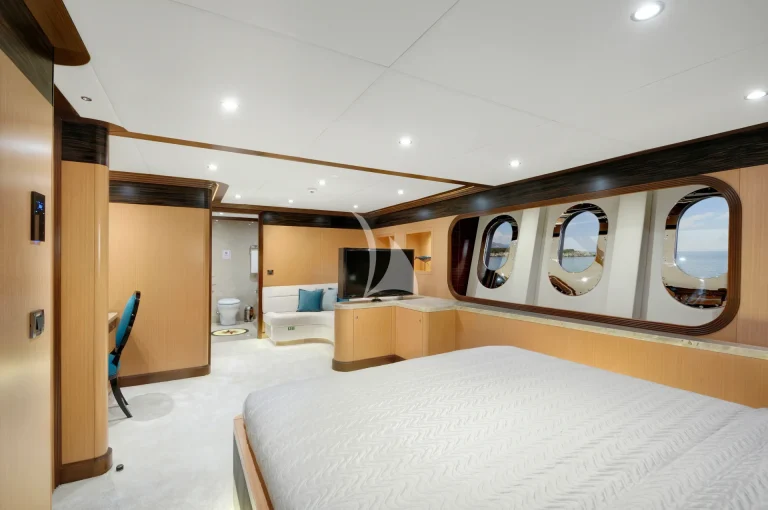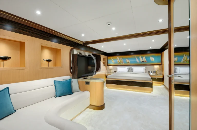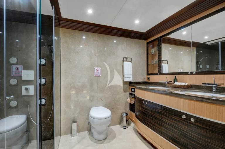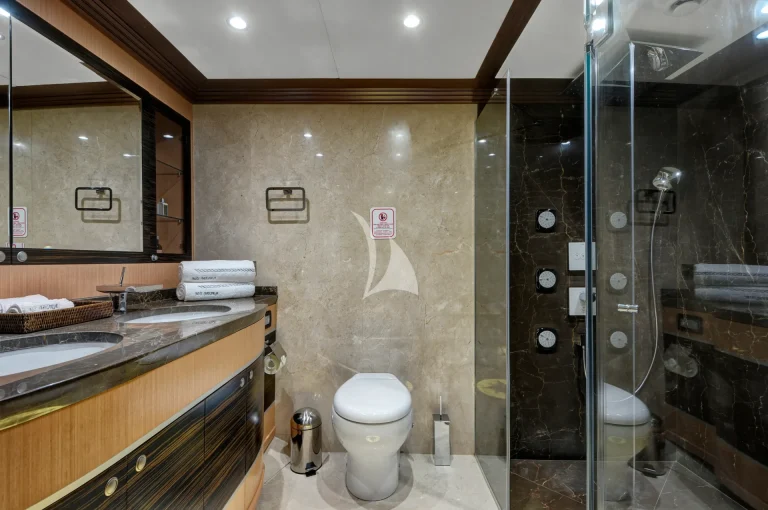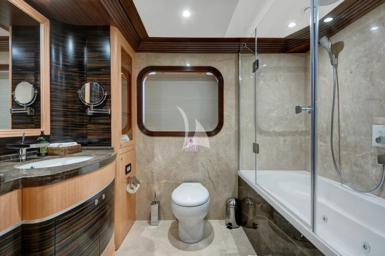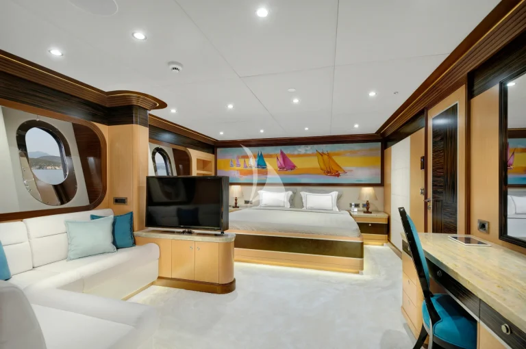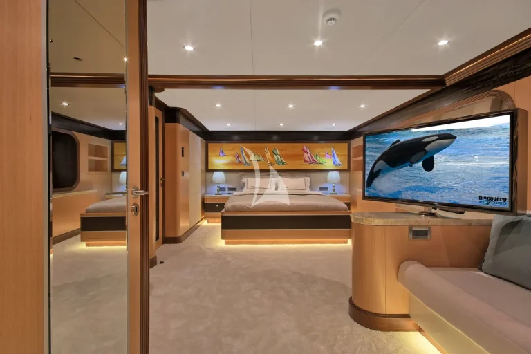 The large master cabin has a large double bed and specially designed for two guests with available two separate dressing rooms, two showers and two toilets. There is also one Jacuzzi in bathroom. The cabin is designed with Ebony and Aningeria, which are combined with leather and marble. The cabin has home automation and entertainment system, which can control air condition, curtains, lights, entertainment system (TV &Custom music system) and there is also minibar, work/make-up desk and sitting area with a large sofa in cabin.