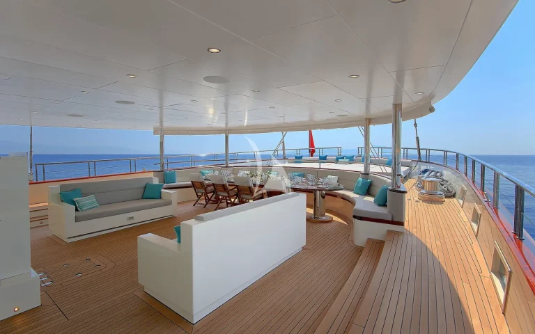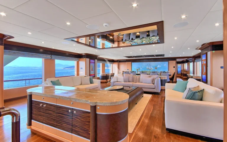 Her outdoor areas are perfectly equipped for relaxation and entertainment while at sea, in particular the large saloon on main deck, which affords also exterior dining place and sofas. There are four sunbathing areas, one large Jacuzzi on fly bridge deck and very large comfortable sky lounge with large main sunbathing area, bar, sofas, dining place and barbeque area.