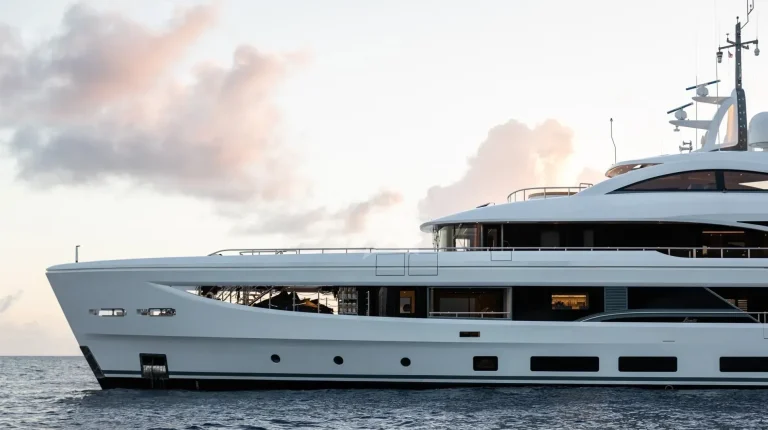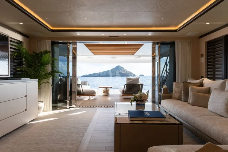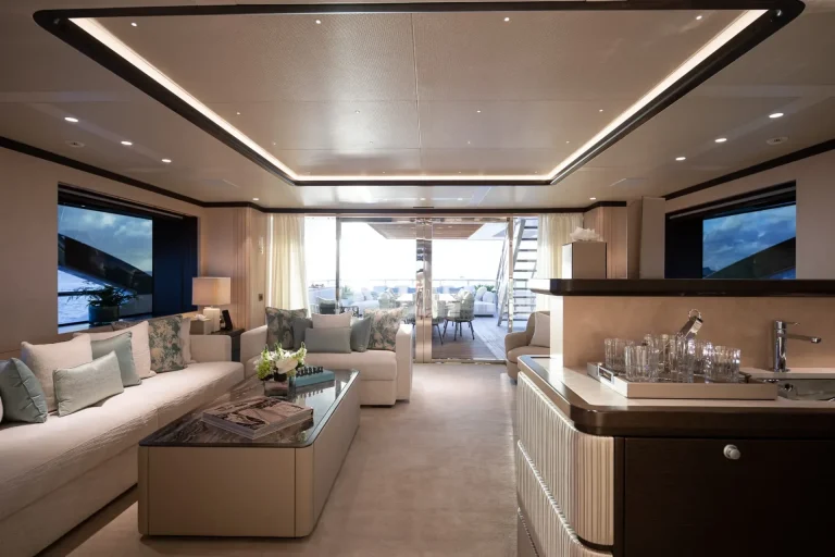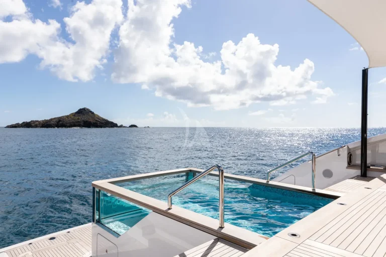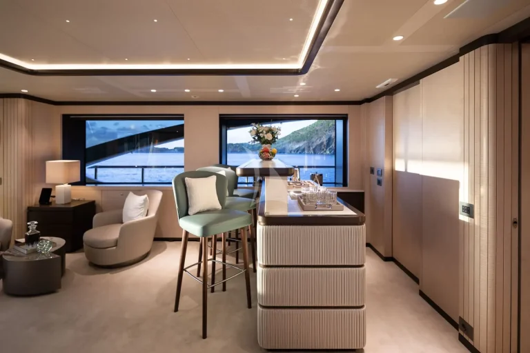 Designed by RWD to maximise the outdoor spaces, she features a main deck panoramic pool lounge area and a 36 sq m aft beach club with large infinity pool, “sea saloon” and fully-fledged hammam.
