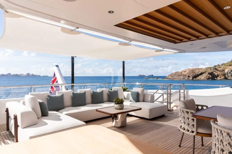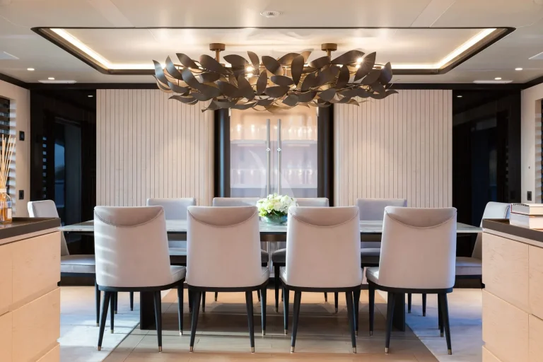 The primary alfresco dining space on board is on the upper deck aft, where lies a rectangular table along with more lounging space – perfect for enjoying late-night drinks in comfort.