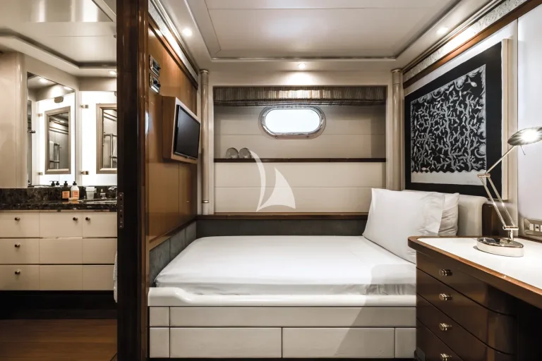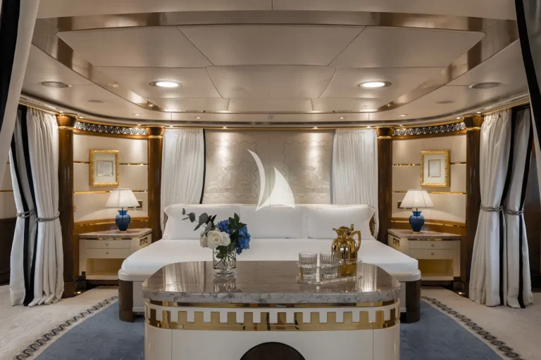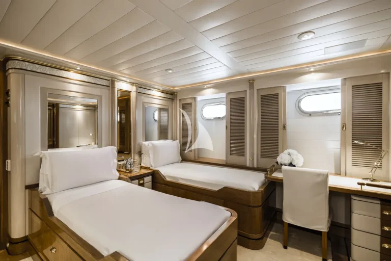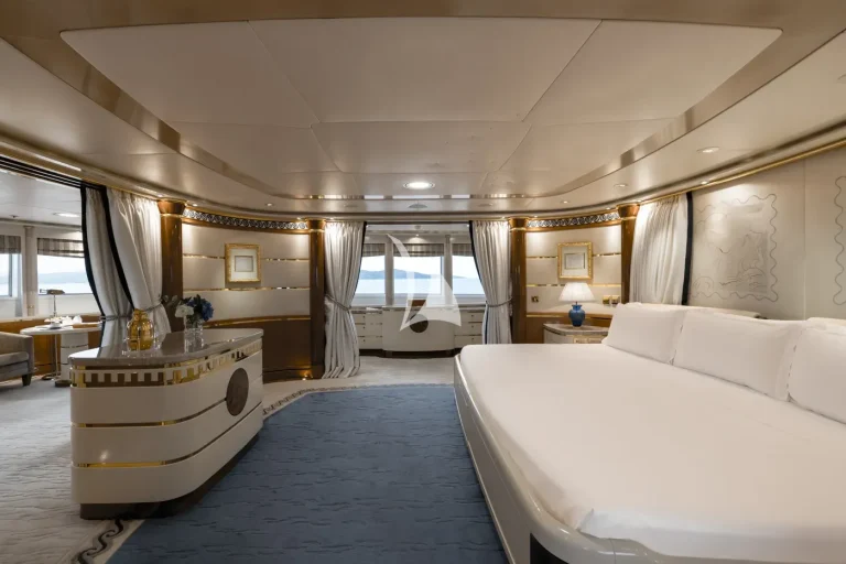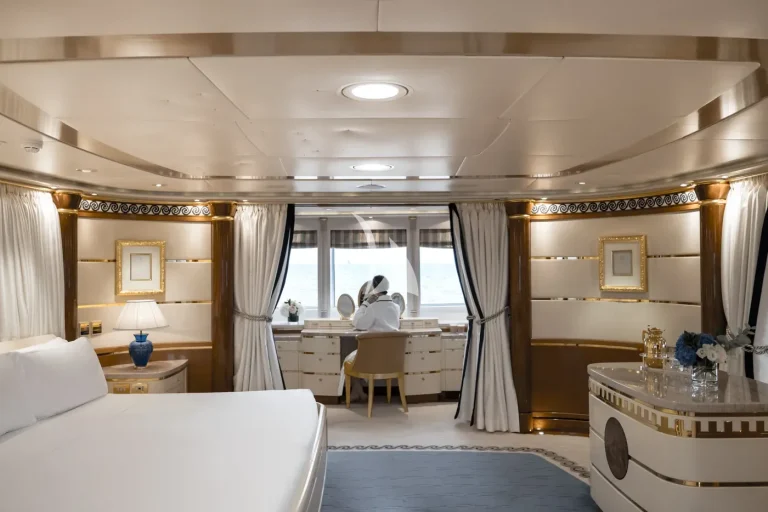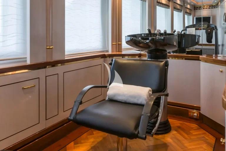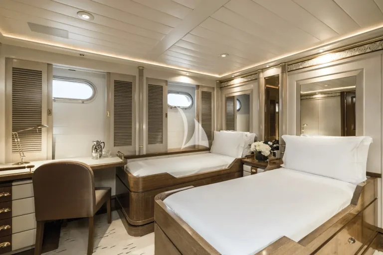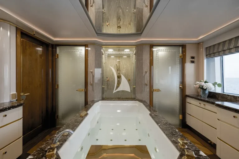 The forward-facing Master suite includes a study, hair salon, walk-in closet, his and her bathroom with whirlpool tub, and a private 180-degree observation lounge. The remainder of guests are accommodated across one VIP stateroom, two double cabins, two twin cabins and two single cabins for extra staff, all with ensuite.