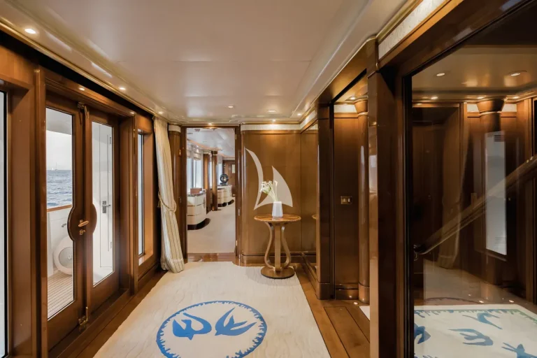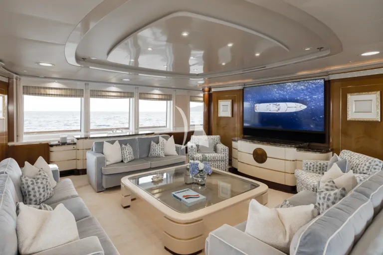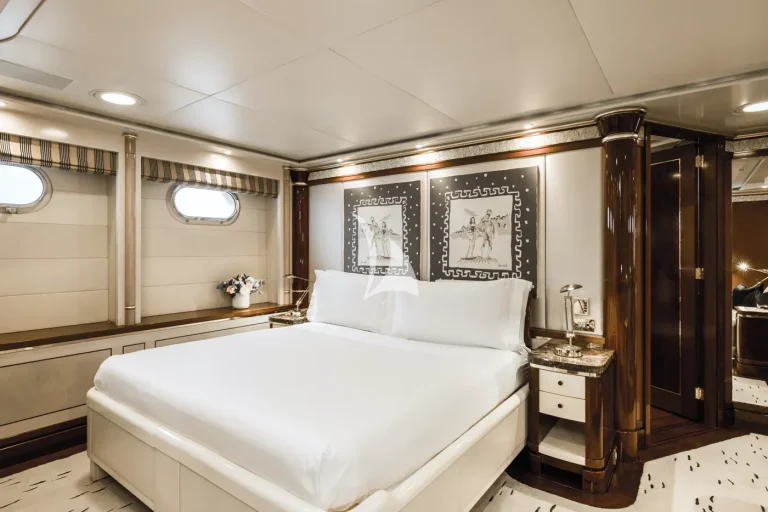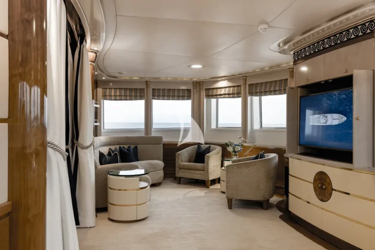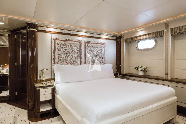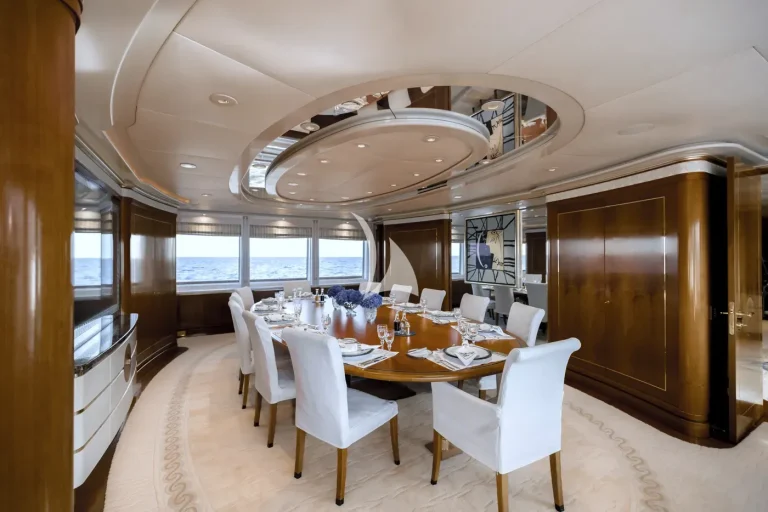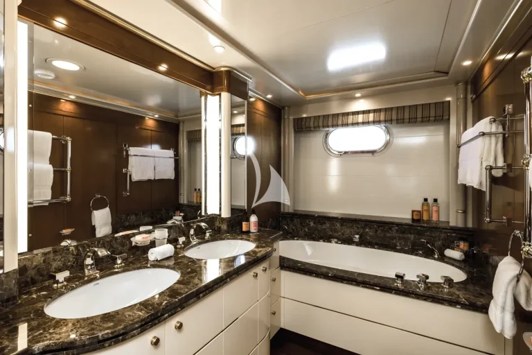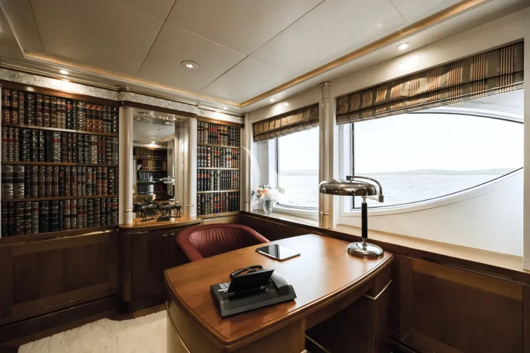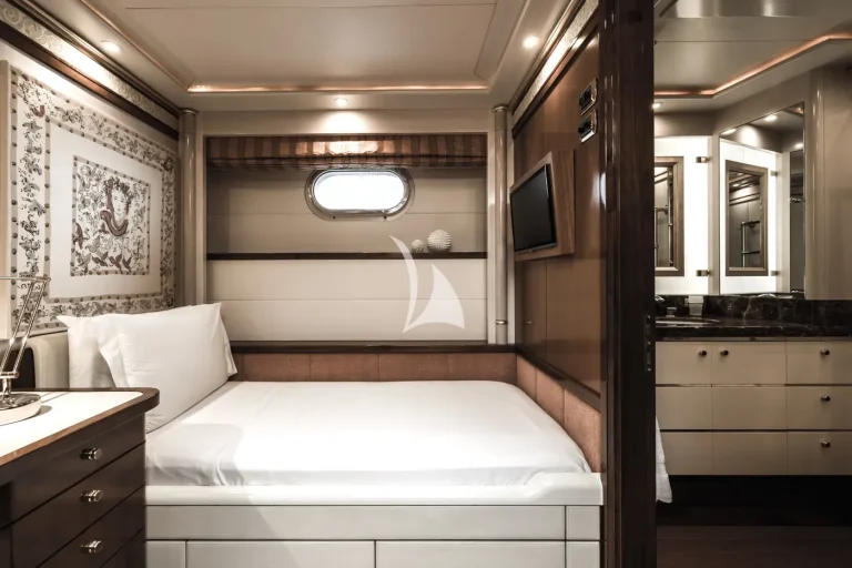 The forward-facing Master suite includes a study, hair salon, walk-in closet, his and her bathroom with whirlpool tub, and a private 180-degree observation lounge. The remainder of guests are accommodated across one VIP stateroom, two double cabins, two twin cabins and two single cabins for extra staff, all with ensuite.
