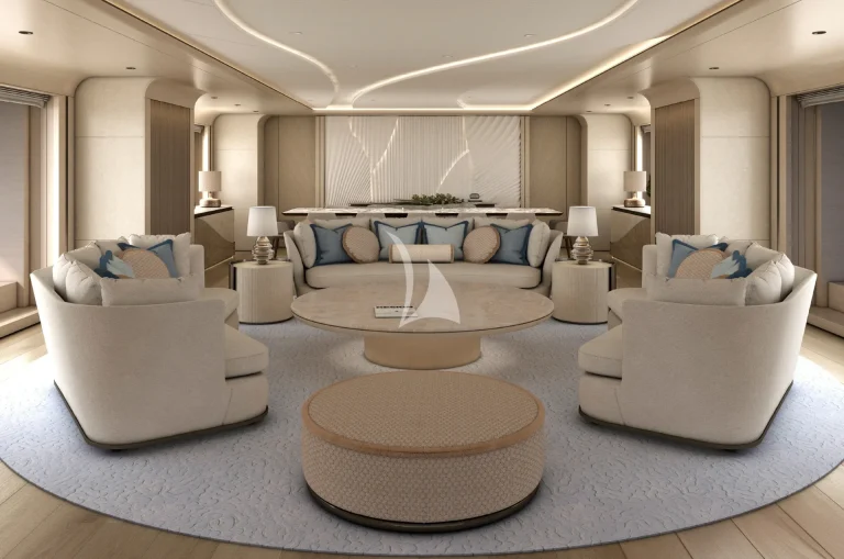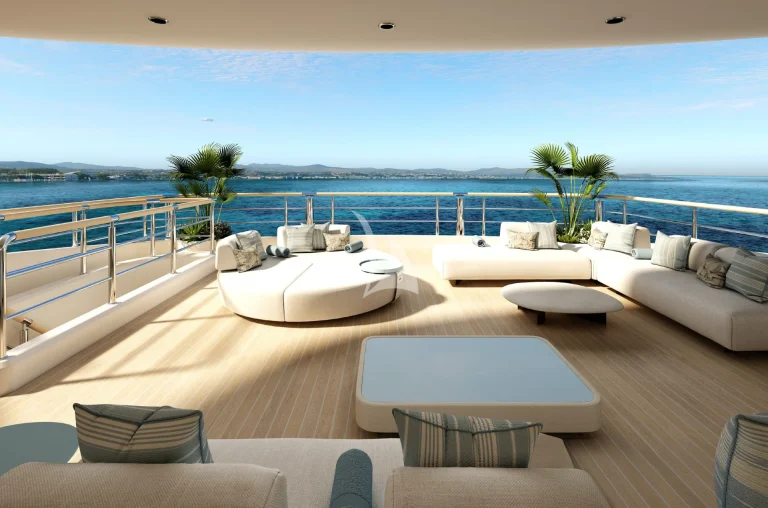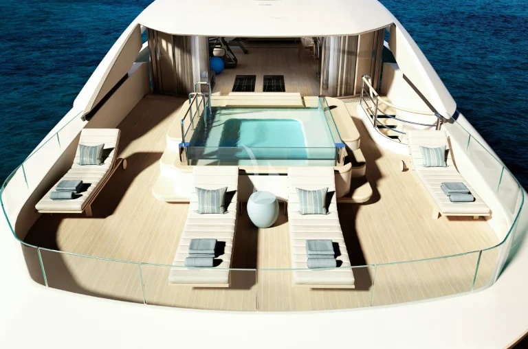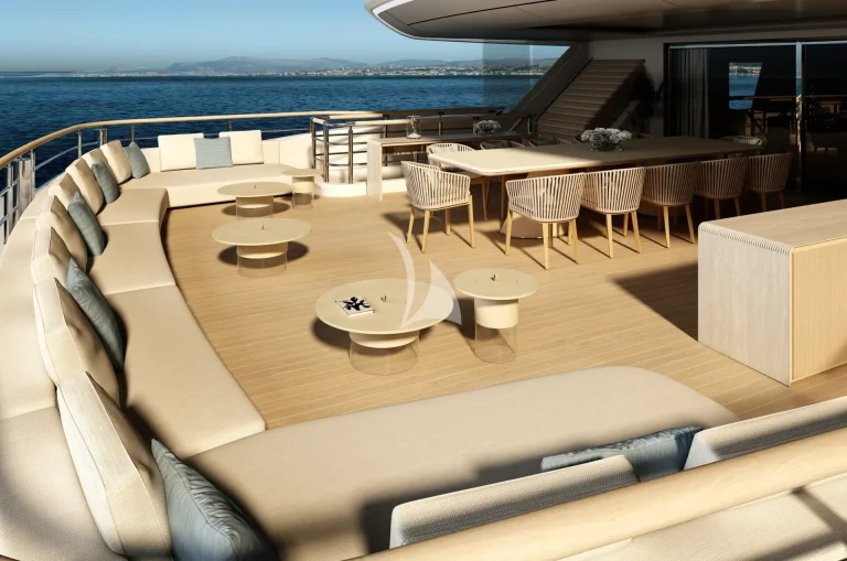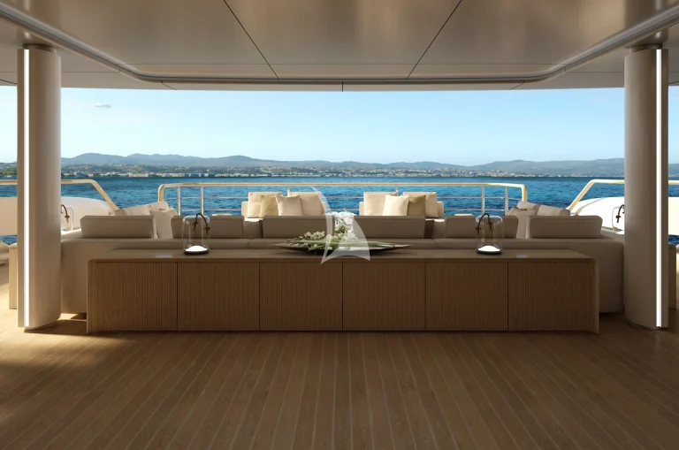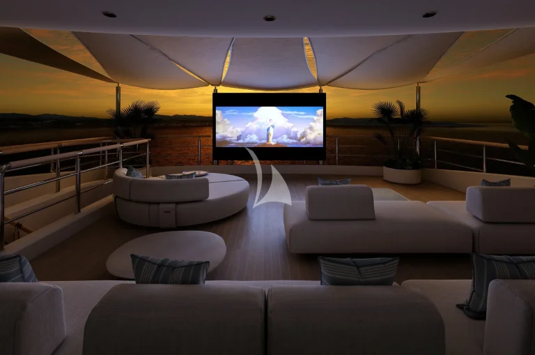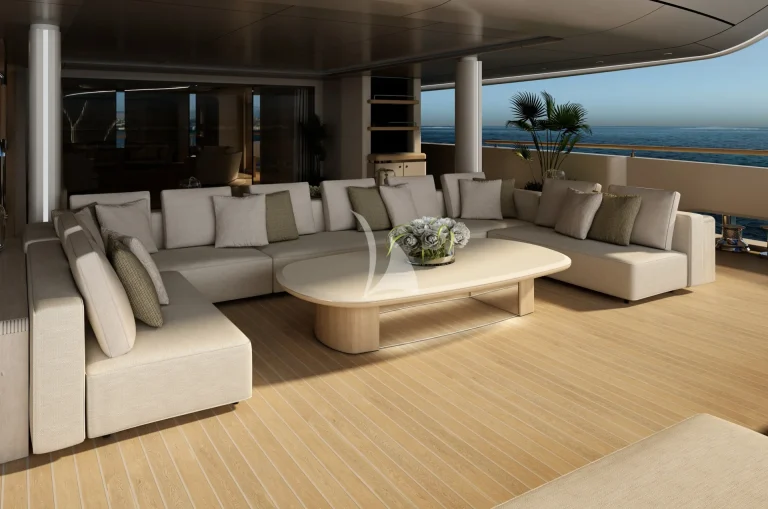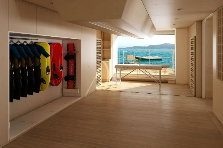 Guests can recharge in style or unwind in the sundeck Jacuzzi with panoramic views. The sundeck features flush deck doors that provide a smooth transition between indoor and outdoor spaces. This versatile area includes a gym with en-suite facilities, a fore-lounge with a custom-designed jacuzzi, sunbeds, and an outdoor cinema with a projector. Fitness and wellness are at the forefront aboard this magnificent charter vessel. A standout feature is the innovative beach club, which includes a spa lobby bar and lounge, a hammam and ample storage for water toys.