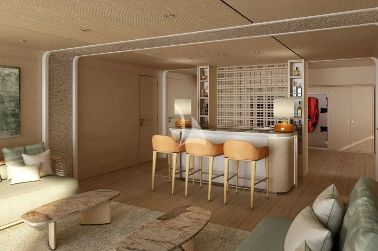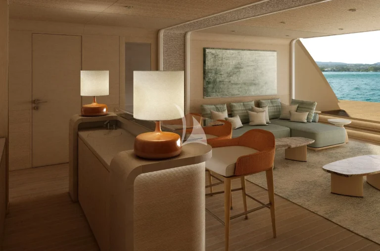 The interiors blend Nordic and Mediterranean influences with light oak, bright tones, and soft, sculptural custom furniture that maintain a relaxing, domestic feel. A plethora of high-end materials, from the finely grained wood paneling that lines the walls to the textured stingray leather, handwoven rugs, straw panels and hand-carved marble, there is a palpable sense of authenticity and craftsmanship. This warm and refined style continues in the saloon and dining area, where elegant design is highlighted by a striking backlit agate dining table.