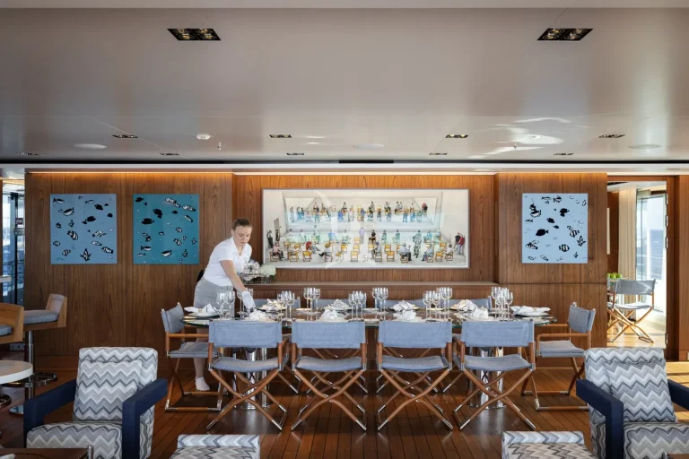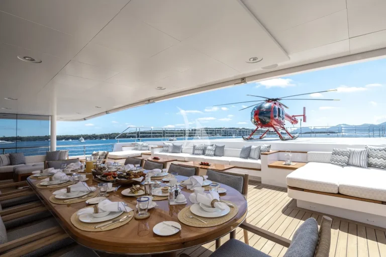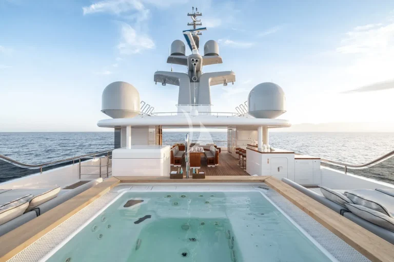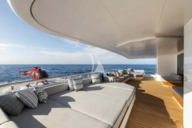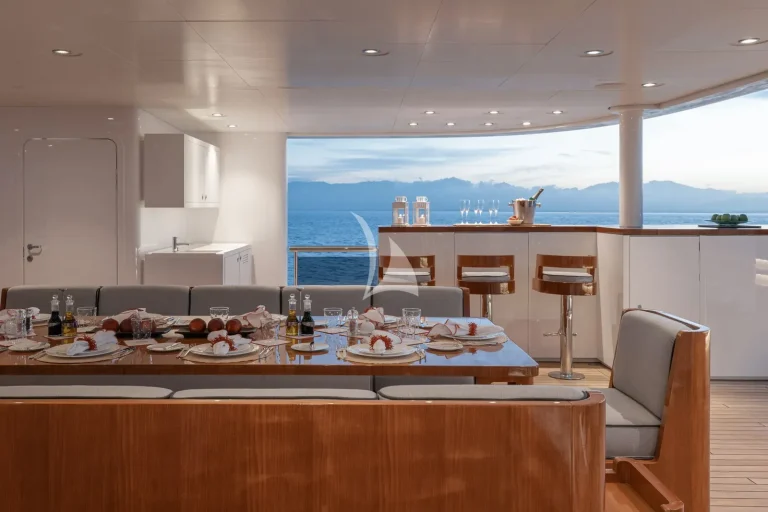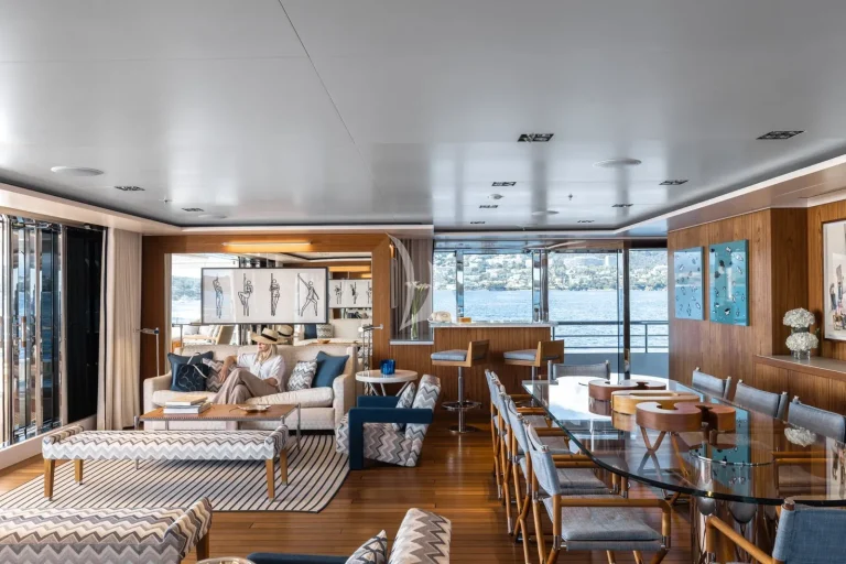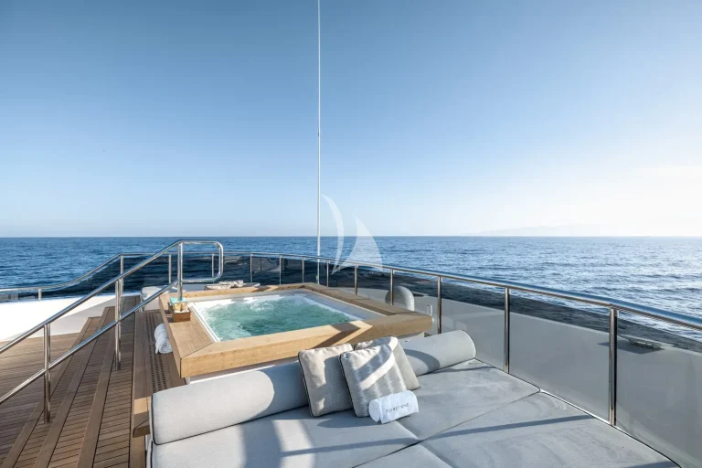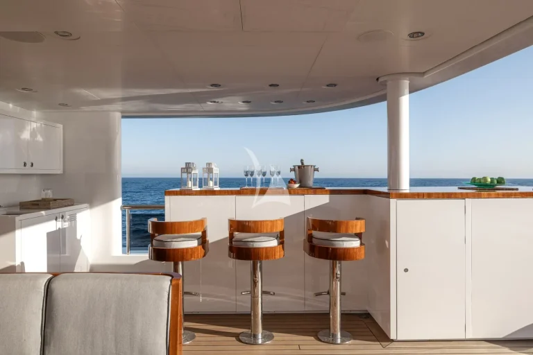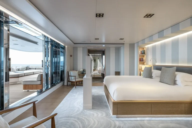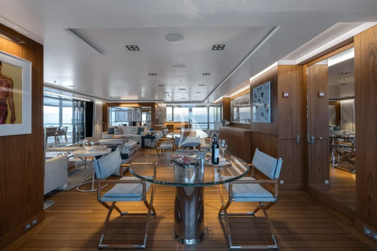 A forward observation lounge affords panoramic 180-degree views and floor to ceiling glass is a feature across the yacht. In the unlikely event that you require a distraction from the outside world, a cinema lives below the observation room.