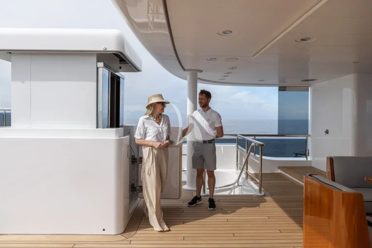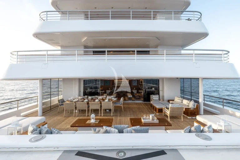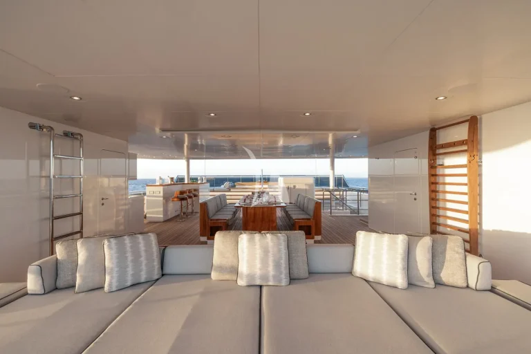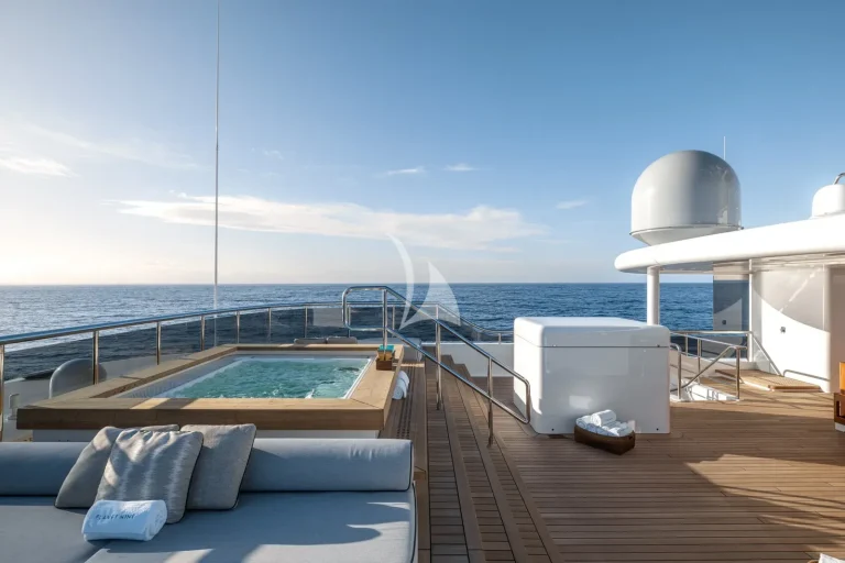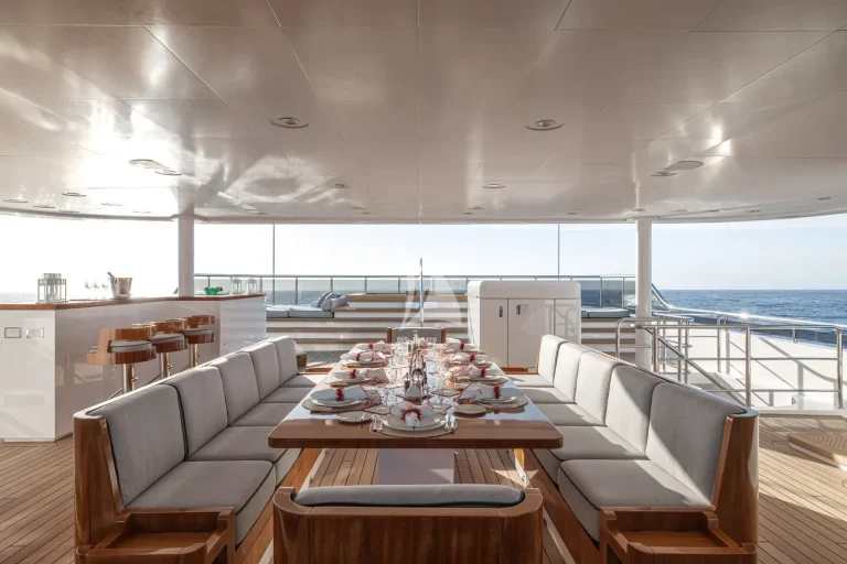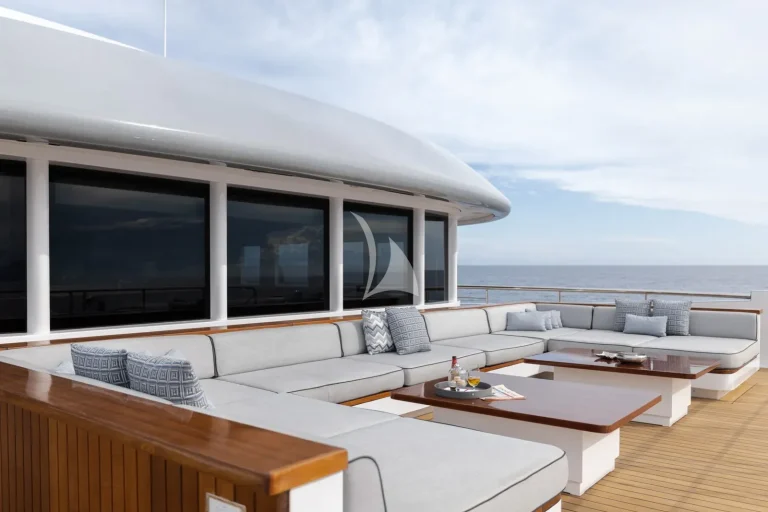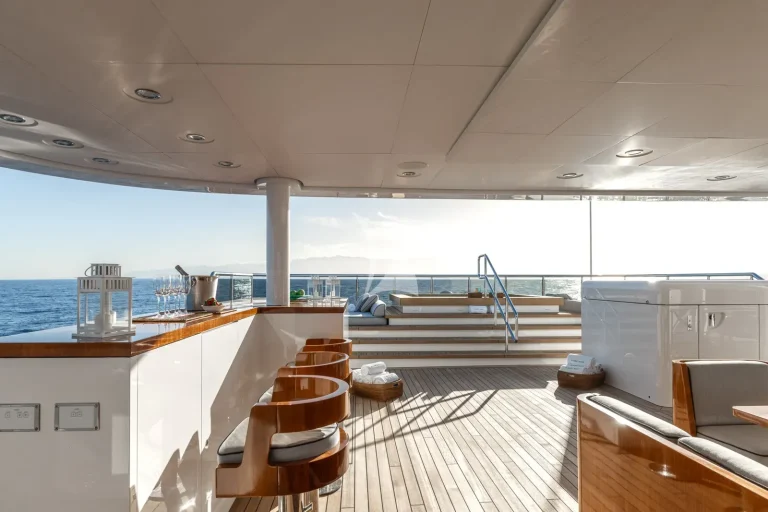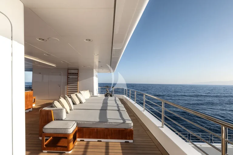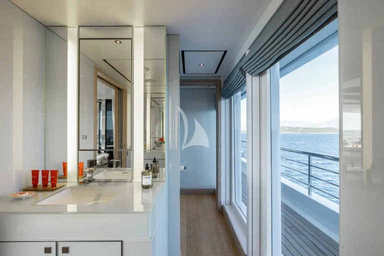 The guest deck enjoys its own entrance and lobby at the stern of the yacht. As you walk to one of five double suites, you will pass the steam room and beach club with its spectacular sea terrace.