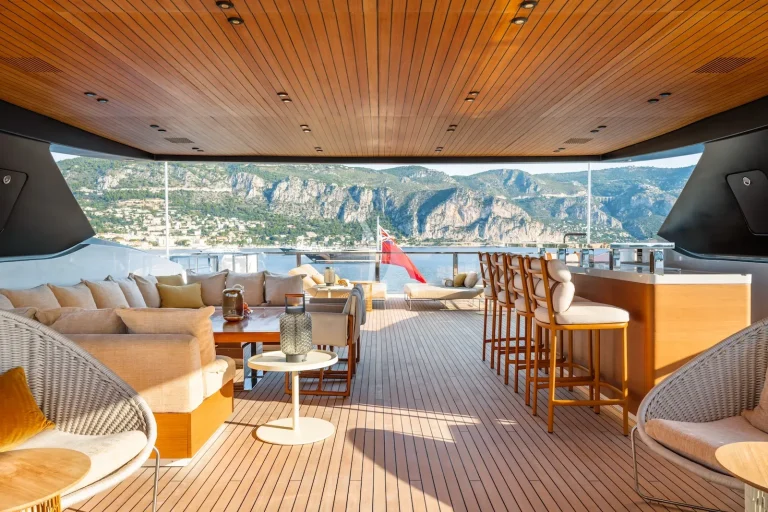 Another tender garage is located in the bow, freeing up all outdoor areas for guest use. The foredeck offers ample space with two conversation areas, creating a relaxed and informal ambience. The glass-bottom swimming pool on the main deck creates a stunning area to enjoy the sunshine, complemented by an al fresco dining area, while the sun deck boasts a bar and is fitted with loose furnishings that can be cleared for exercise if needed. R.M.F. features a 12-person dining table on the aft bridge deck, offering panoramic ocean views and a serene, open-air atmosphere, perfect for more formal dining.