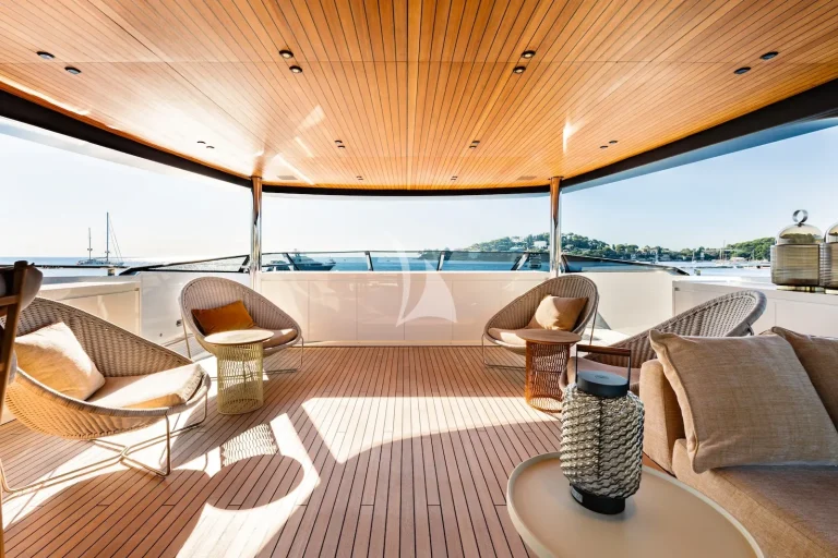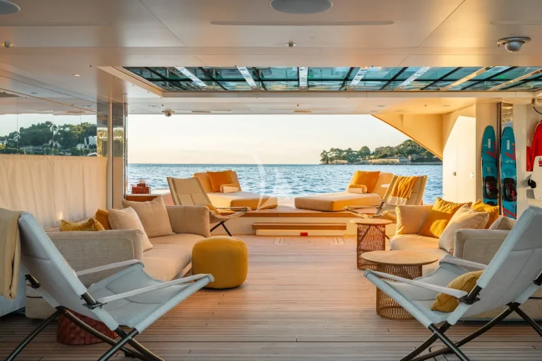 She boasts a long list of outstanding features, with her beach club presenting 270-degree views, thanks to fold-out balconies on both port and starboard, perhaps the most impressive. The beach club is tranquil, and the reflected sunlight through the overhead swimming pool accentuates its charm. The beach club on board R.M.F. is a fully equipped wellness suite, connected to a gym area, shower and ensuite. When not in use, the beach club ingeniously transforms into a floodable garage, large enough for the 7.2m Castoldi tender – perfect for sunset cruising.