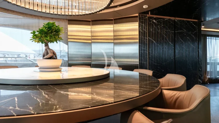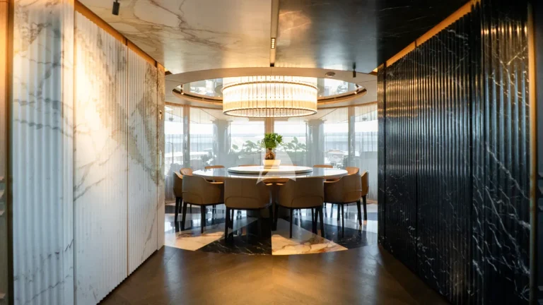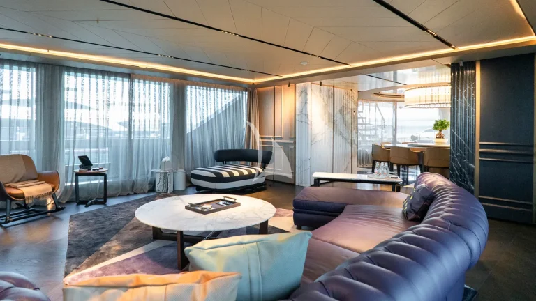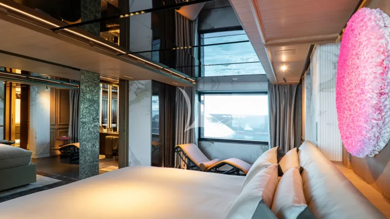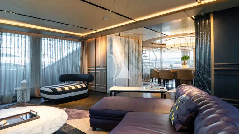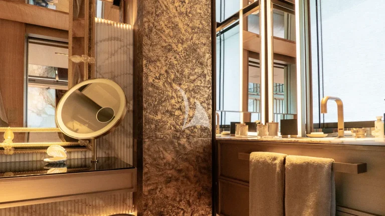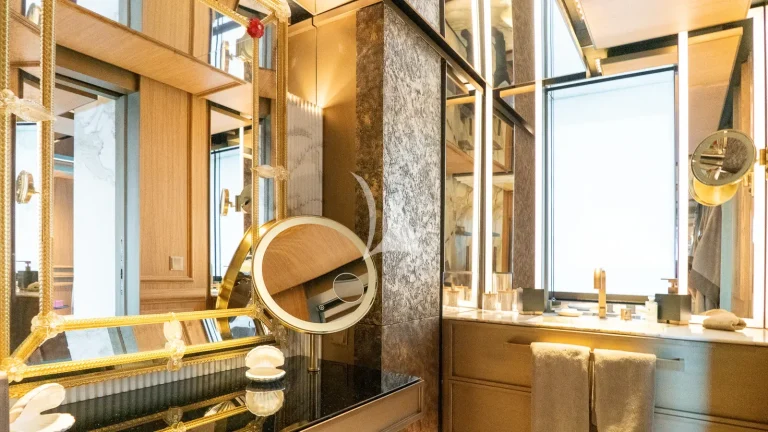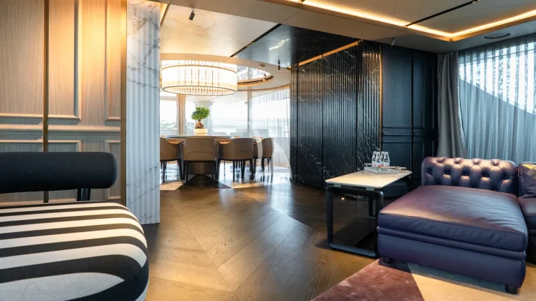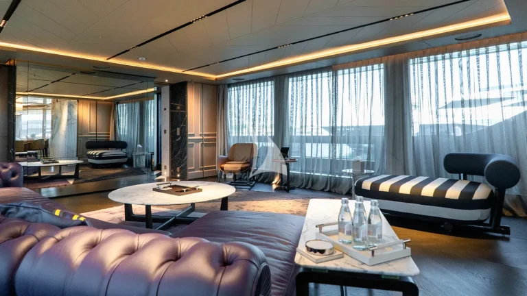 Her expansive exterior decks are thoughtfully designed for both entertainment and relaxation. From the sweeping sundeck with a gold-detailed mosaic swimming pool to the stylish beach club at water level, RAJA² invites you to immerse yourself in the yachting lifestyle. Whether you’re sipping cocktails at sunset or enjoying a private moment by the sea, every space is curated for memorable moments.