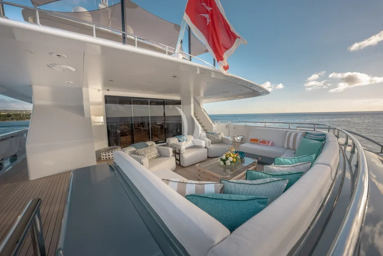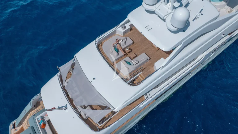 The standout outdoor spaces include Reliance’s impressive sundeck, on which there is a jacuzzi, sun loungers, lounge chairs and a well-equipped bar with a teppanyaki grill, ensuring the drinks are always chilled and the entertainment is nonstop. Alfresco dining is available on the upper deck, where large lounge sofas also provide a relaxing and sociable layout.