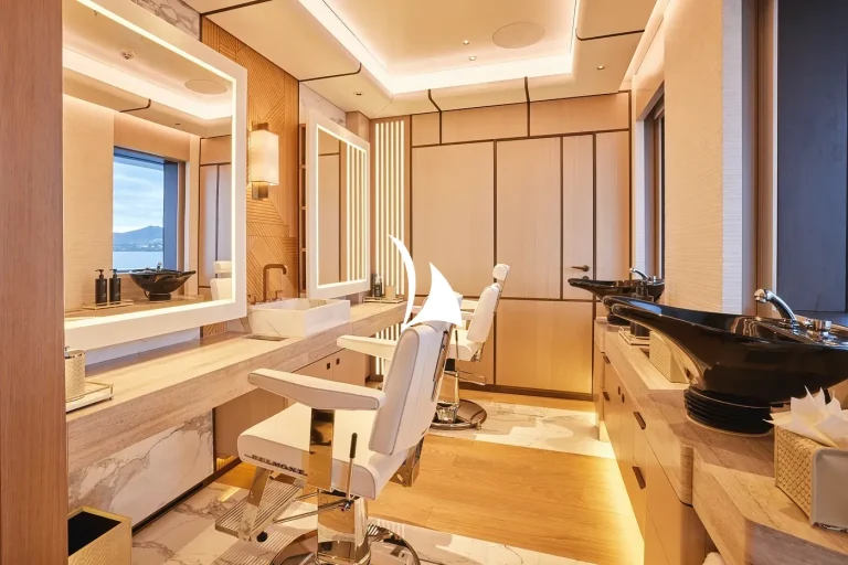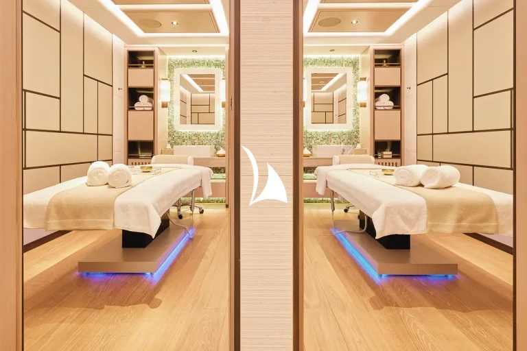 Amenities are a plenty on RENAISSANCE, highlights include the expansive beach club showcasing the latest watertoys to keep guests entertained plus a bar and waterside dining area, a stunning swimming pool on the main deck aft and a fabulous spa deck. The spa deck is a revelation, and includes the fitness centre with extensive equipment list, hot and cold plunge pools, steam room and sauna. Treatment rooms plus a hair and beauty salon complete the spa deck setup. A commercially certified helipad facilitates additional options for guests’ arrivals and departures to the yacht.