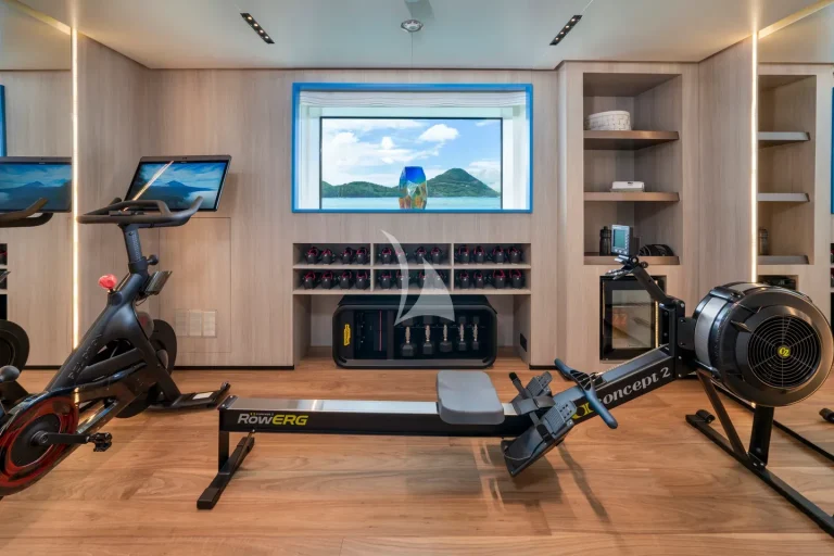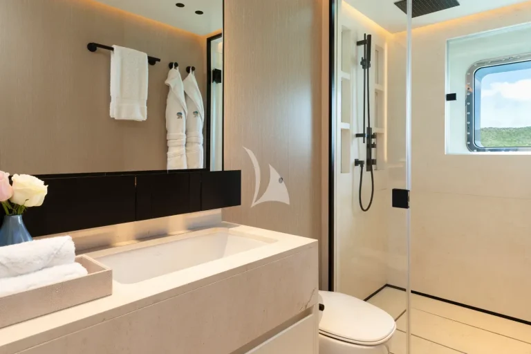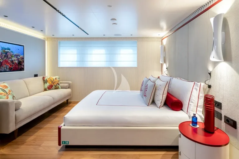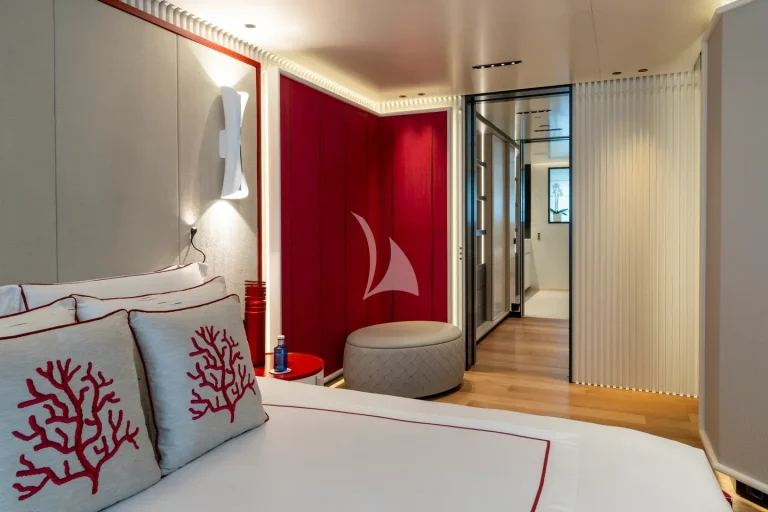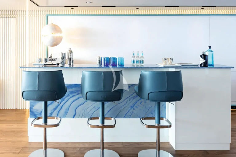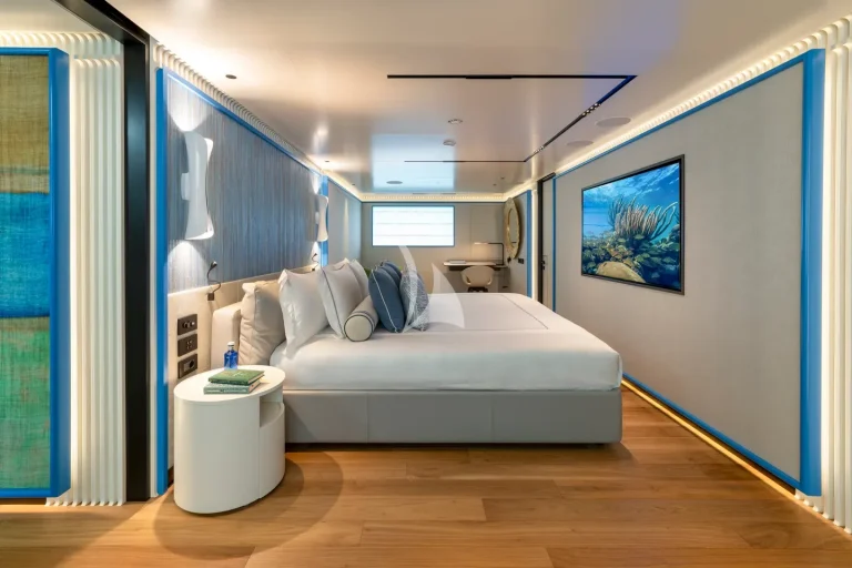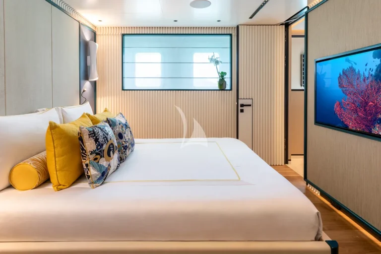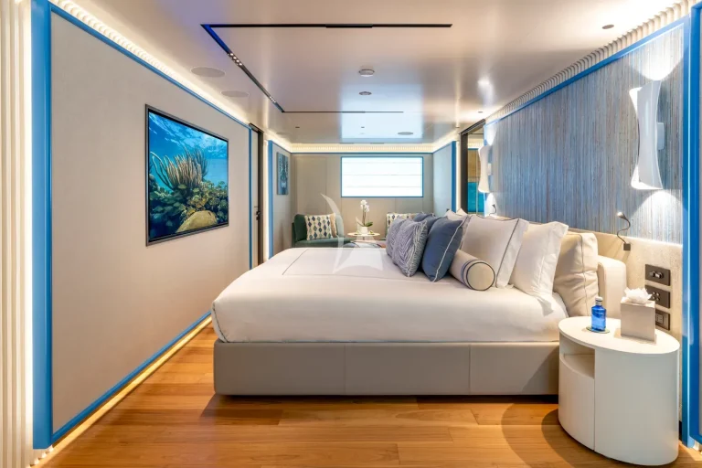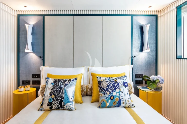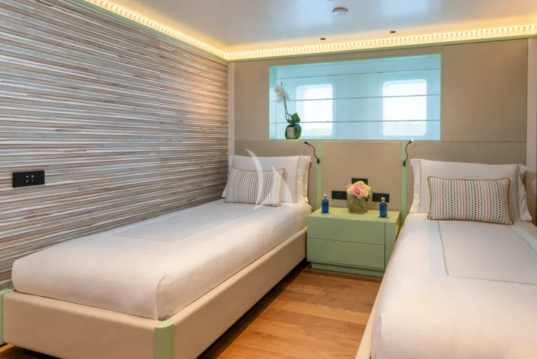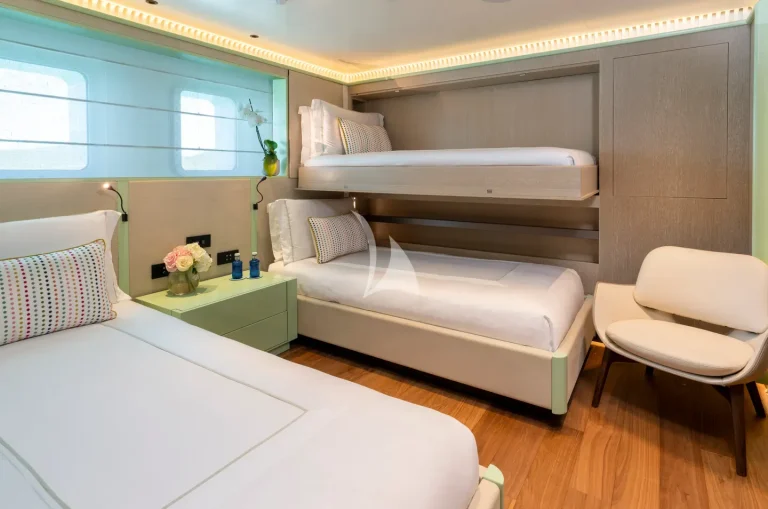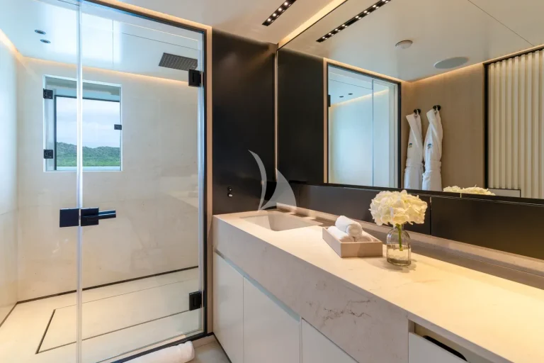 RIO accommodates 12 guests in seven luxurious staterooms, including three primary suites: an upper-deck owner’s cabin with a private terrace, a main-deck VIP, and a lower-deck VIP. Additional cabins include two doubles, a twin with a Pullman, and a bunk ideal for a nanny or security.