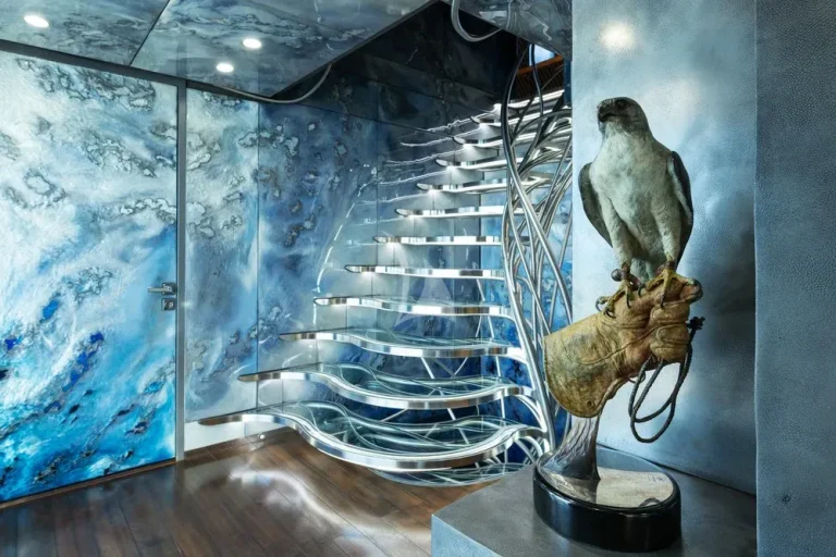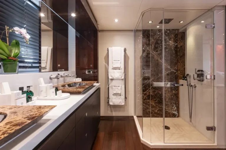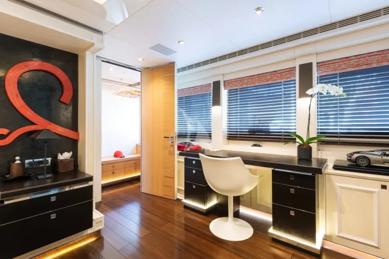 A magnificent statement staircase in chrome leads down to a backlit marble lobby on the main deck. Aft is the main lounge, a formal dining area and a cosy snug, leading through to another adaptable space on the aft deck, where steps lead down to the swim platform and its plethora of toys. Forward is the full-beam master suite, with his and hers bathroom with bath, a walk-in wardrobe, sofa to port and an office area to starboard.