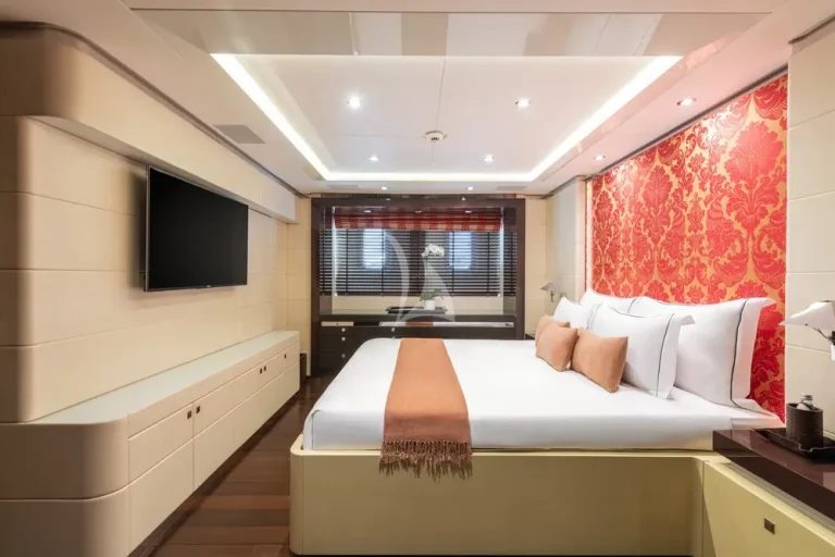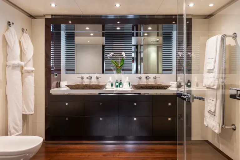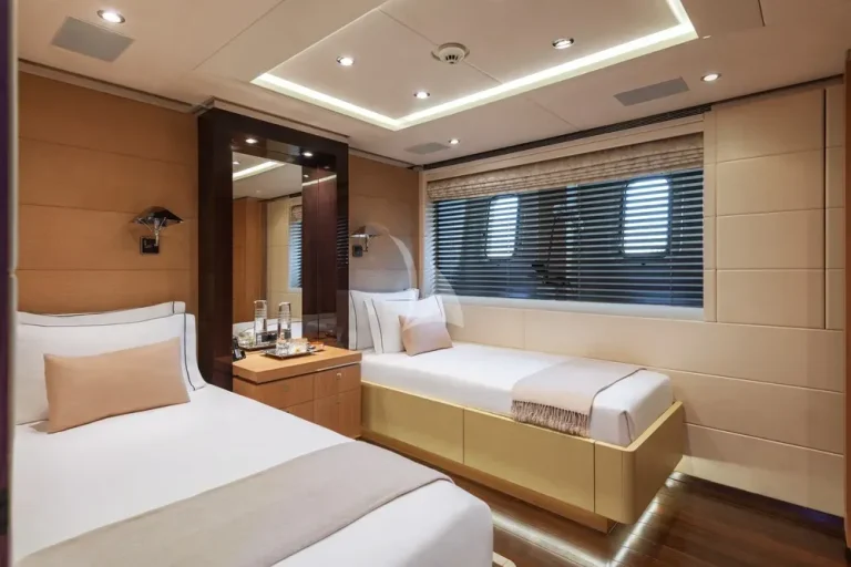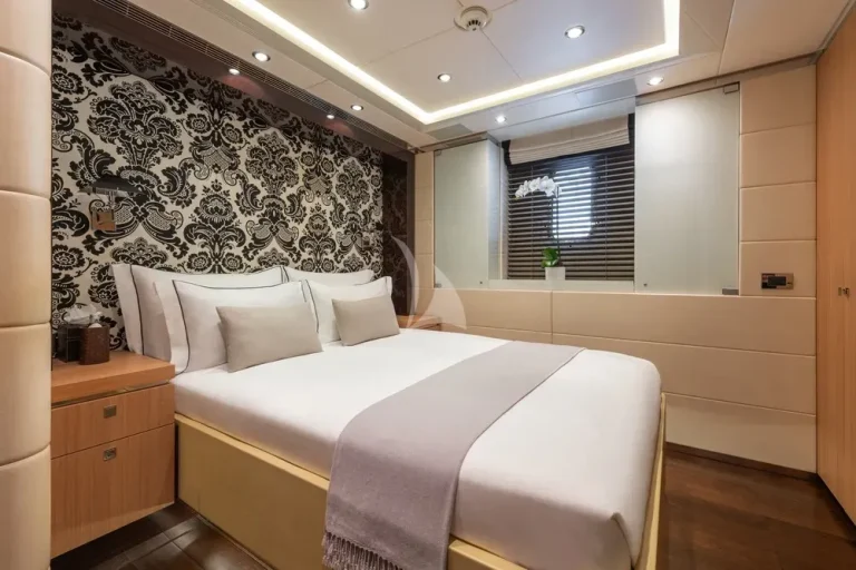 Steps lead down to the guest lobby where there is a full-beam VIP suite, two double cabins and two twin cabins, completing versatile accommodation for 12 in six cabins.