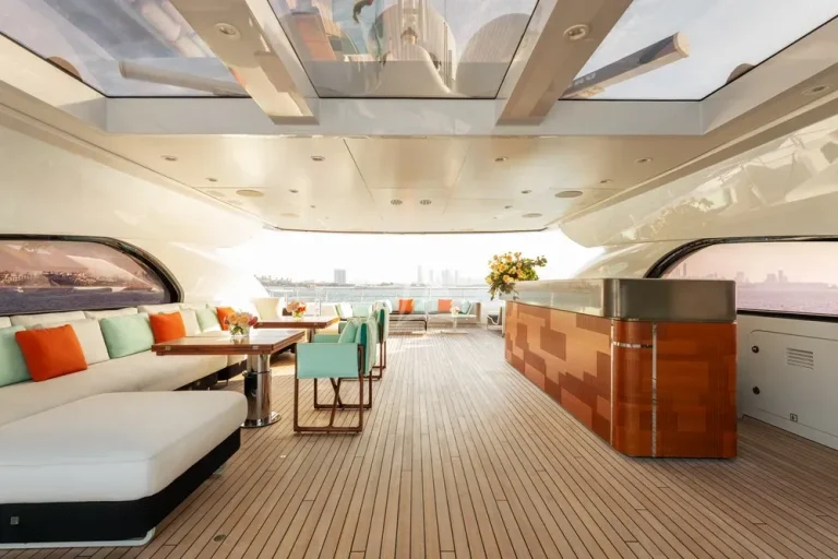 Her sun deck has a large jacuzzi forward flanked by sun pads and surrounded by glass screens. Aft, under skylights, is a genuine sky lounge with walk-up bar, picture windows and large sliding glass doors fore and aft, making it a wonderful place for dining under the sun or the stars in any weather.
