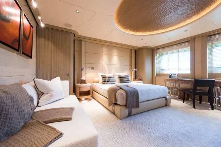 Sleeping up to 12 guests across a range of 6 rooms, charter yacht ROMEA includes 1 master suite, 1 VIP stateroom, 2 double cabins, 2 twin cabins, and 2 pullman berths. Capable of discreetly carrying up to 25 crew, luxury yacht ROMEA ensures charter vacations with a memorably premier service.