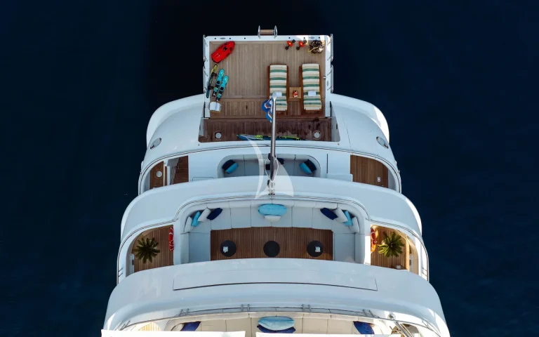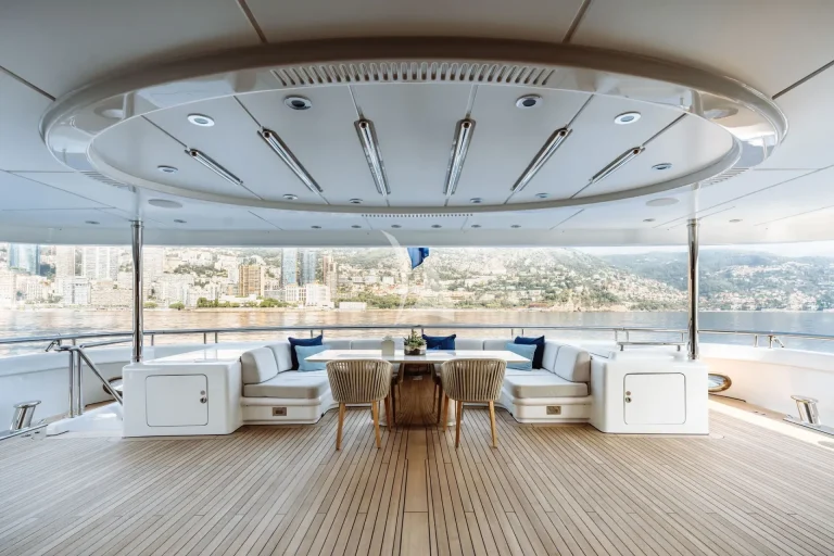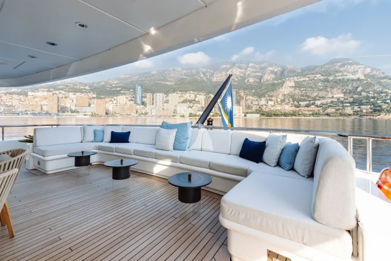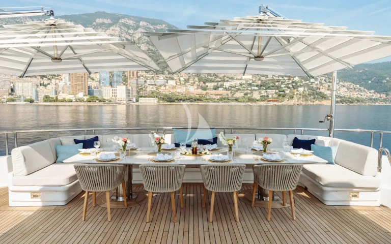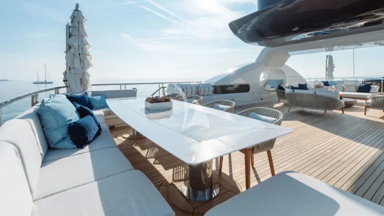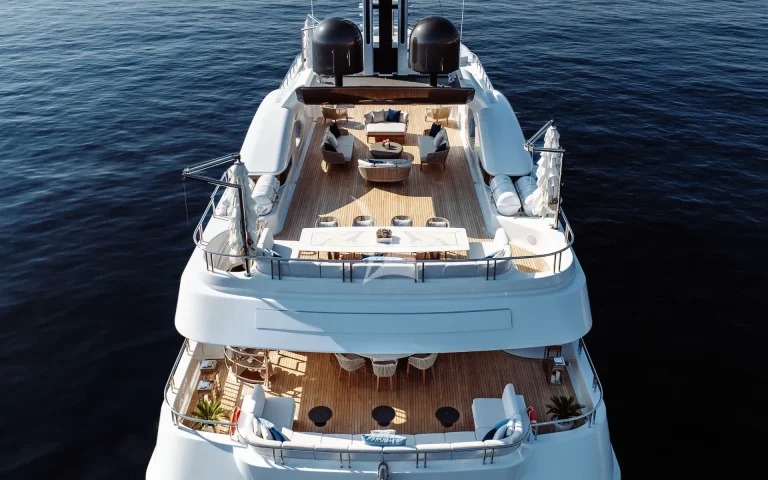 SAMIRA’s exterior deck spaces are equally impressive, inviting guests to bask in the sun, seek shade, or indulge in alfresco dining against the backdrop of the open ocean. Whether lounging on the expansive sundeck or enjoying leisurely moments with loved ones, every corner of SAMIRA beckons to be explored and savored. The retractable transom further enhances the outdoor experience, providing additional space for sunbathing and direct access to the inviting waters below.