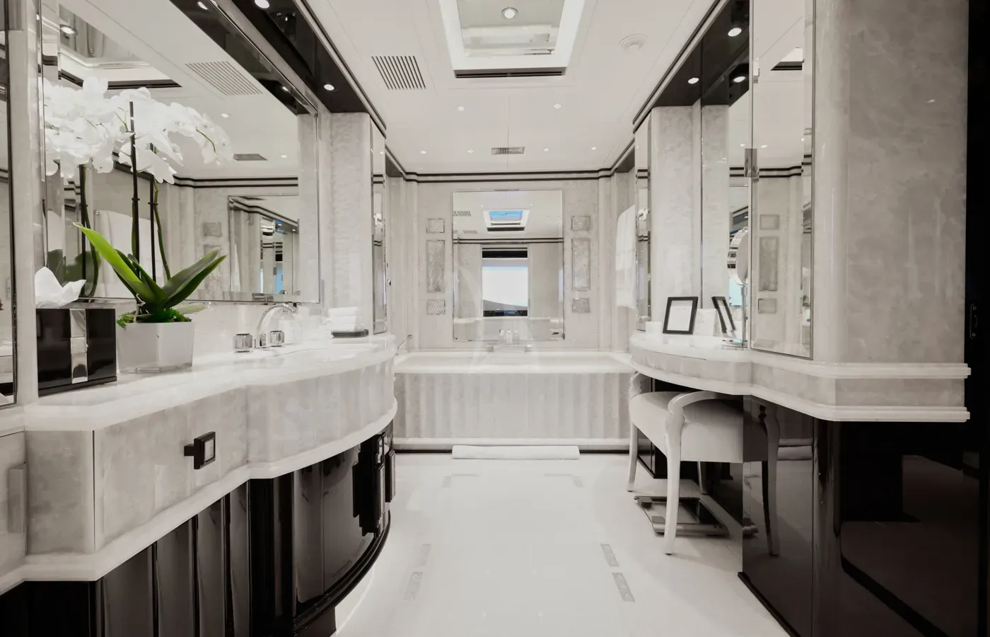 An Art Deco theme runs throughout the interiors and exteriors of SILVER ANGEL, with glossy black oak panelling complemented by Onyx and white furnishings and lots of mirrors, while white marble and silver leaf add some glamour and sparkle. She can accommodate 12 guests across 7 cabins, including a full-beam Owner’s suite on the main deck forward. The rest of the guest accommodation is spread across a further four doubles, including a VIP cabin on the upper deck, and two twin cabins on the lower deck.