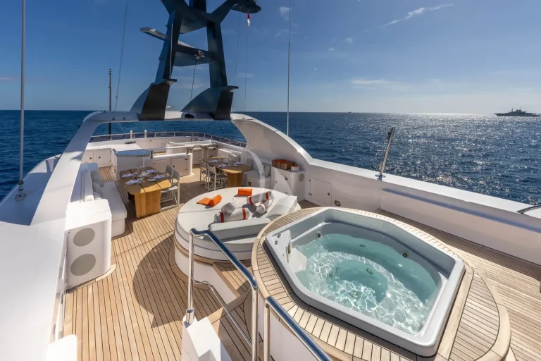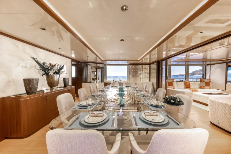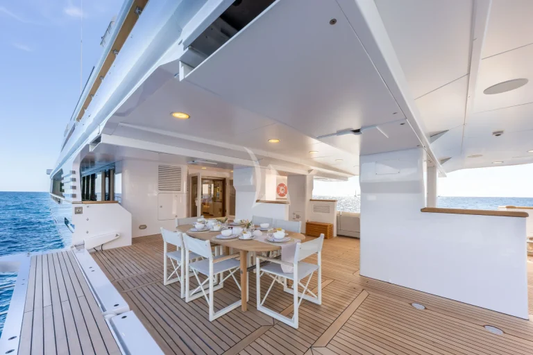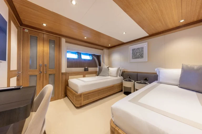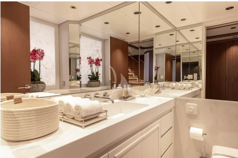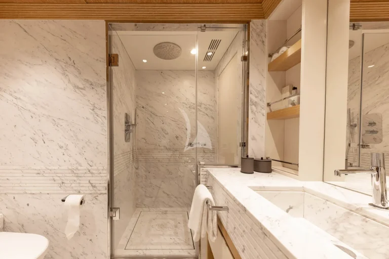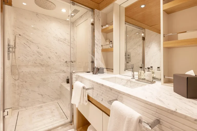 On the Lower Deck, guest accommodation is located, made up of 2 spacious double cabins each with en-suite and two twin cabins, of which one can convert into a double cabin. Just like the master en-suite, all bathrooms onboard SOLAFIDE are finished in marble and wood, with top of the range systems for an unbeatable pamper.