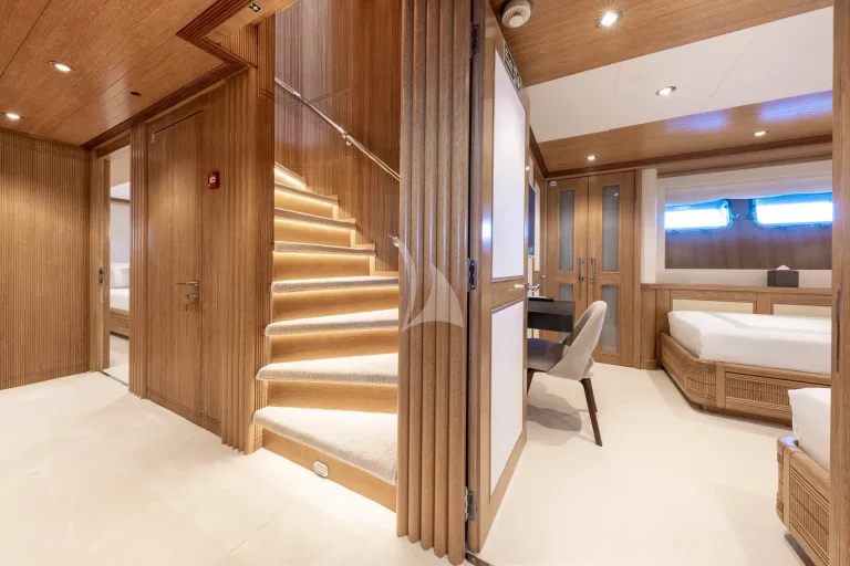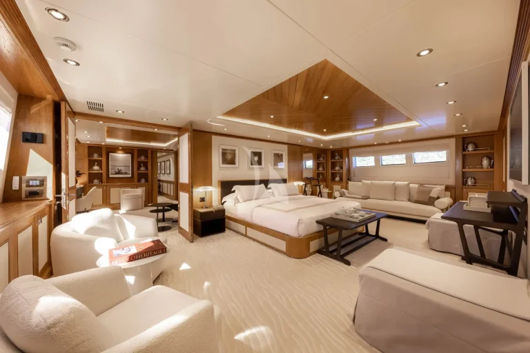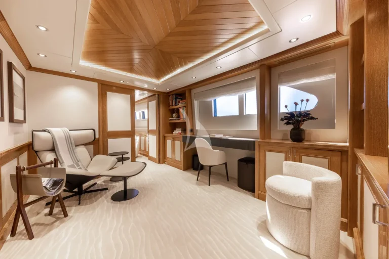 Located on the Main Deck, is an incredible full-beam master suite, equipped with en-suite, dressing room, lounge area and office. Stand out features in the master suite include a sauna, spacious dressing room and frame TV.