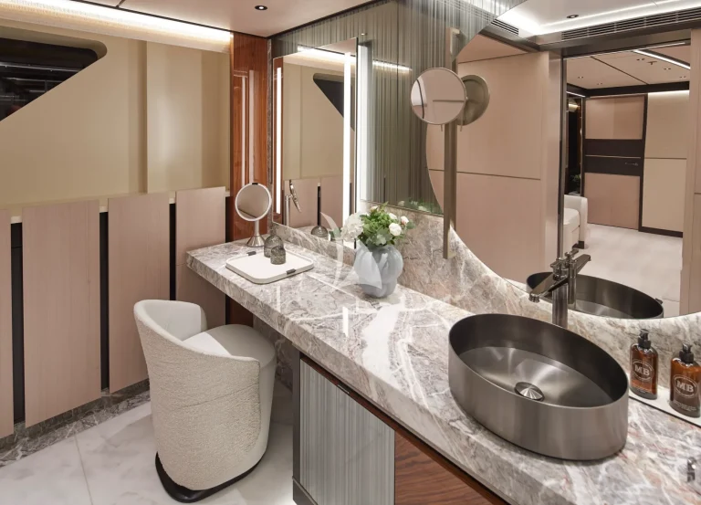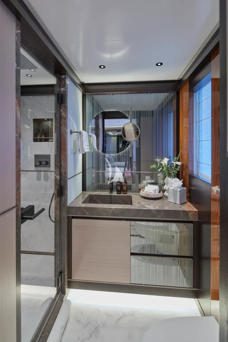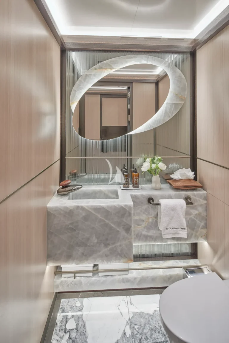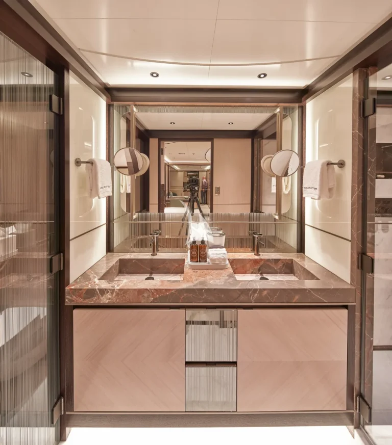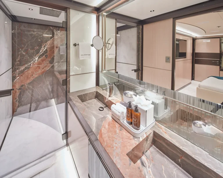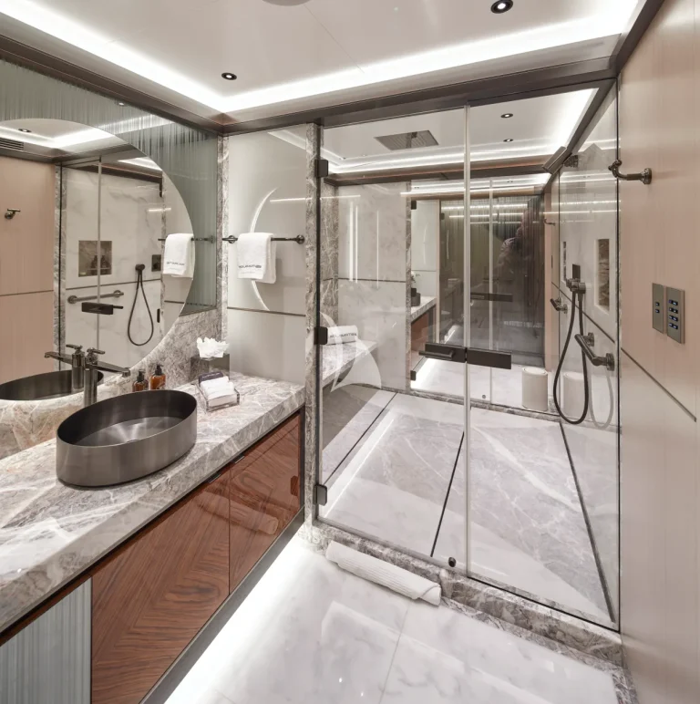 With a volume of 760 GT, Solemates accommodates up to 12 guests across six impeccably curated staterooms. The full-beam owner’s suite, located on the main deck, features his-and-hers master baths that converge in a striking central shower—an indulgent retreat designed for both style and comfort. Three generous VIP cabins—one situated on the wheelhouse deck and two on the lower deck—are complemented by two well-appointed twin cabins, each offering the same elevated experience. Every stateroom is thoughtfully designed with marble-clad en-suites, refined decorative accents, and premium toiletries, ensuring guests feel effortlessly cared for. Sophisticated lighting and modern finishes enhance the inviting ambiance, while advanced in-room technology elevates the experience further with the latest Starlink satellite connectivity for all digital entertainment seamlessly integrated. Guests can stay connected in comfort, wherever their journey takes them.