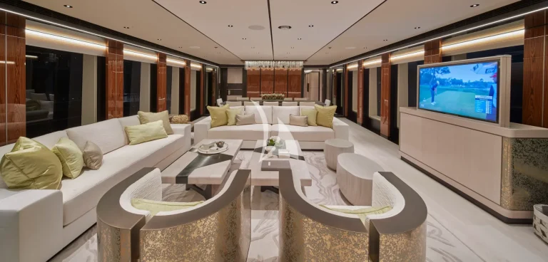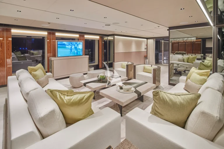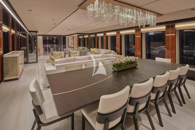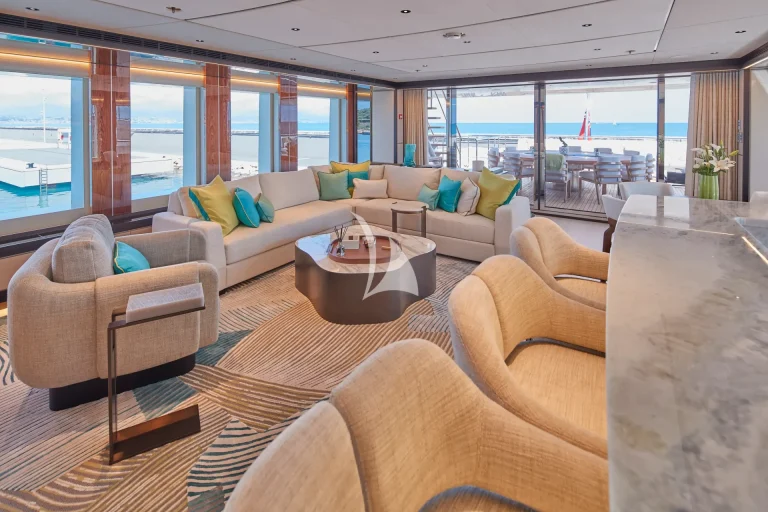 The interior of Solemates is a masterful blend of sophistication and vibrant, family-friendly elegance. Thoughtfully styled by the owner in collaboration with Luca Dini, every detail reflects refined taste and curated luxury. At the heart of the yacht, a striking central atrium with a dramatic staircase creates an architectural focal point, while an added French balcony in the owner’s suite offers an intimate, immersive connection to the sea. The main deck is framed by expansive windows that flood the space with natural light, highlighting modern furnishings and custom design elements—including a bespoke dining table by D’Tales and lighting from the “Radiant Collection” by John Pump in the master suite. Throughout the yacht, exquisite furniture selections from Holly Hunt, Maison Pouenat, Christian Liaigre, and Alexander Lamont complete the interiors, delivering a warm, contemporary atmosphere that is both inviting and unmistakably grand for every occasion.