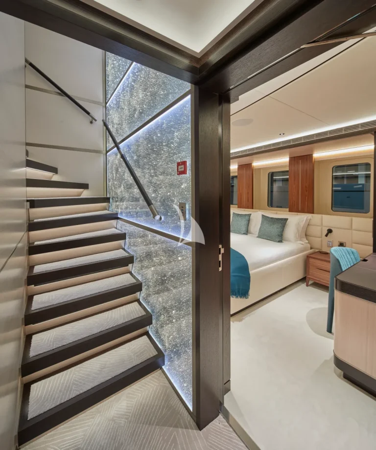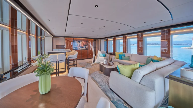 Solemates makes a striking impression with bold, masculine lines by Omega Architects, enhanced by a vibrant palette of lime green, teal, and aqua blue. Her expansive exterior spaces include a 110-square-metre sun deck featuring a large whirlpool/jacuzzi, bar, and lounge, all furnished with elegant pieces by Neal Jones, Siebensee, Summit, Sutherland, and Dedon. On the main deck aft, relaxed seating flows into double stair access to a fixed swim platform, offering seamless entry to the beach club, sauna, and onboard gym. Upgraded stairways improve circulation throughout, while the bridge deck boasts a raised seating area and alfresco dining—perfect for private evenings beneath the stars.