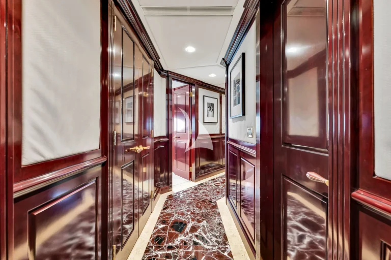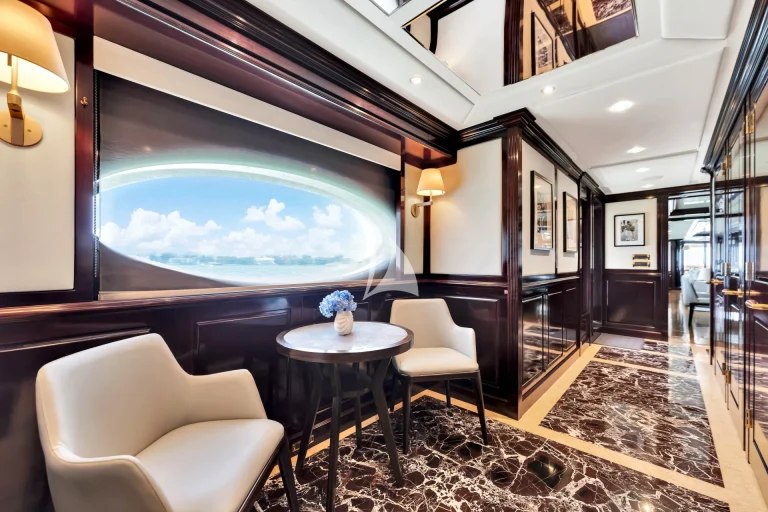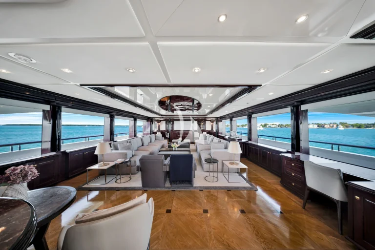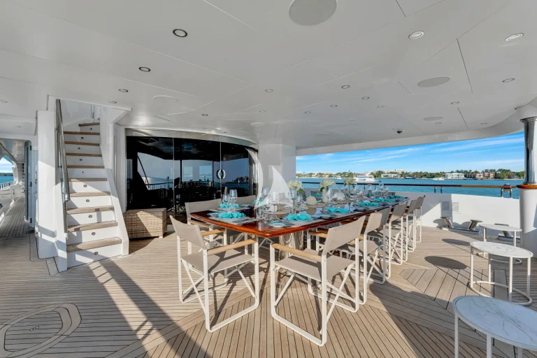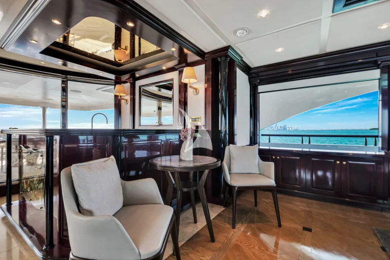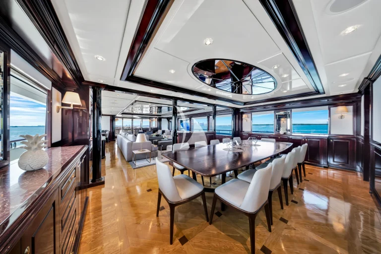 Indoor dining area on the main deck for elegant meals in a climate-controlled setting