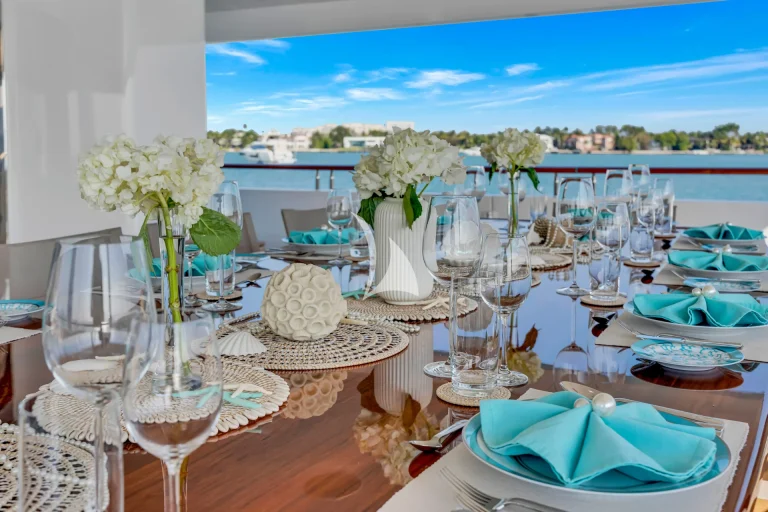 Alfresco dining on the aft deck with ocean breezes and beautiful backdrops