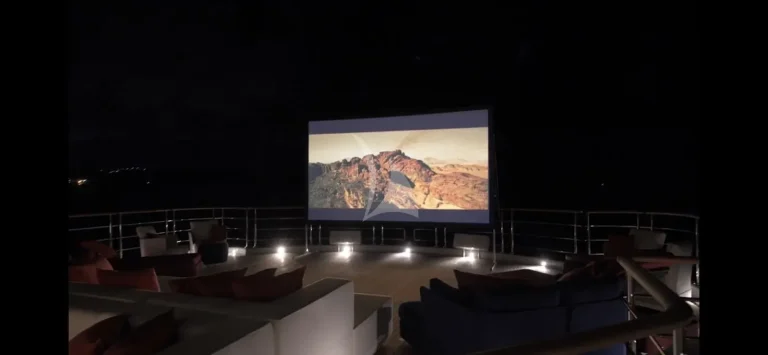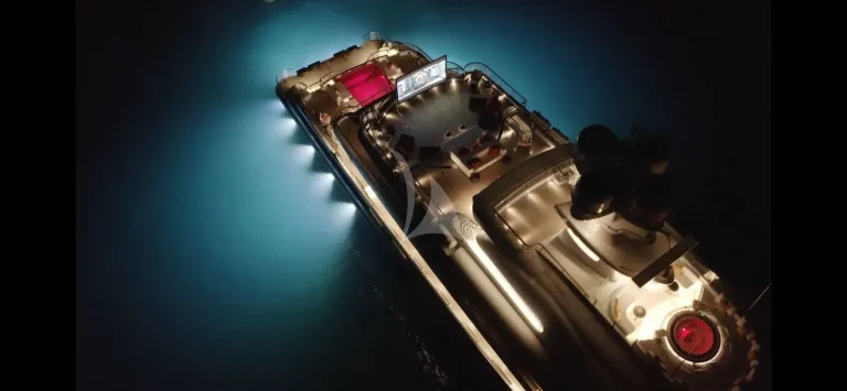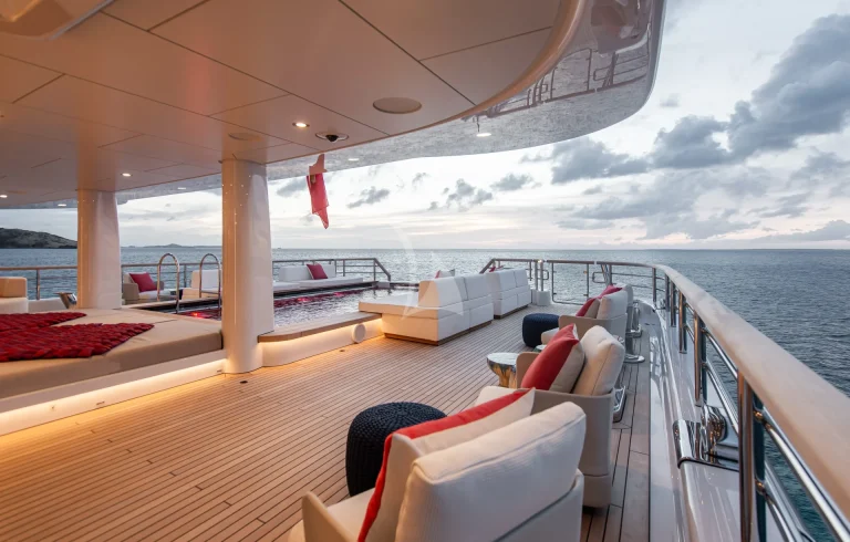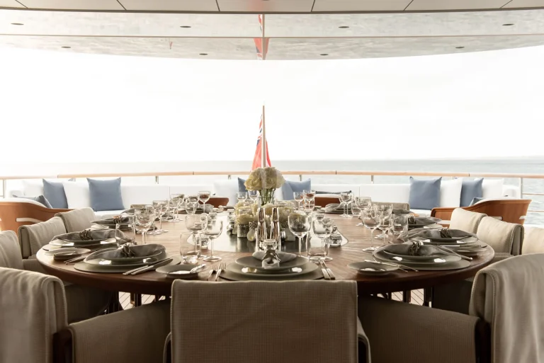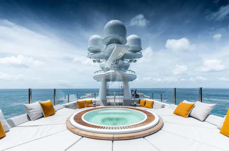 SYNTHESIS offers several other deck areas including sun deck with jacuzzi, seating/ lounging areas and gym equipment. The bridge deck aft that serves both as the perfect location for pre dinner drinks next to the adjacent dining room as well as a large outdoor cinema.