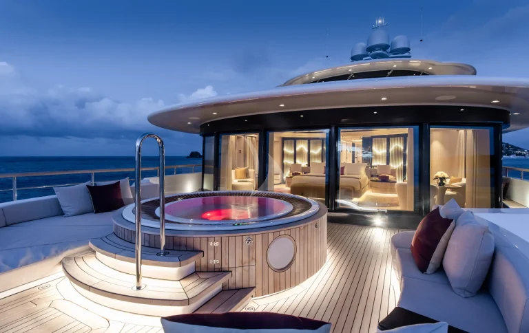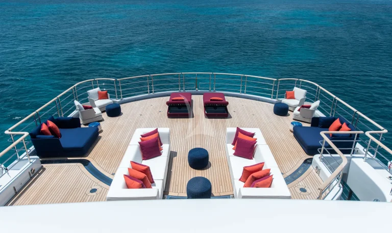 SYNTHESIS offers spacious accommodation with a relaxed beach house feel for 12 guests in six staterooms. She has a dedicated Owner’s deck with master stateroom with private jacuzzi/seating and sunbathing area forward, his and hers baths, office and salon. On the main deck there are two VIP staterooms and on the lower deck a double stateroom and two twins.