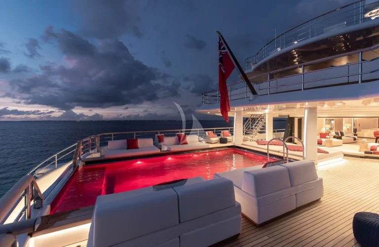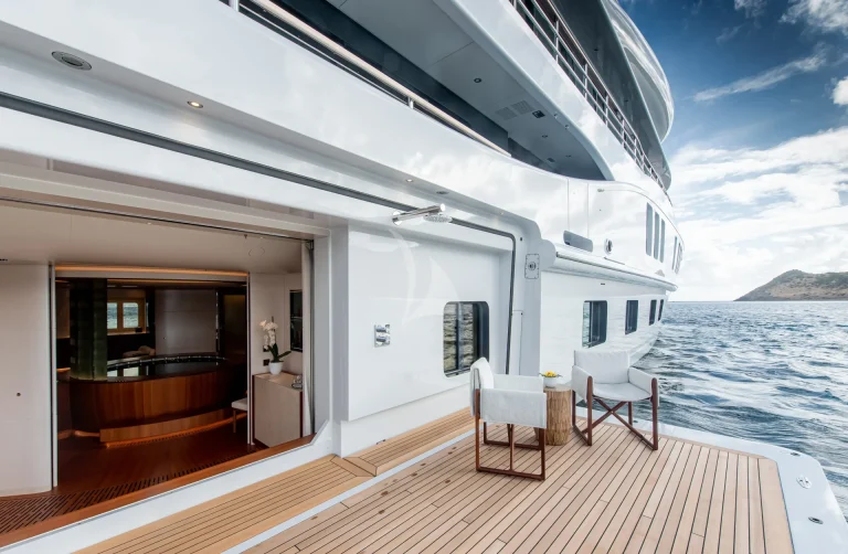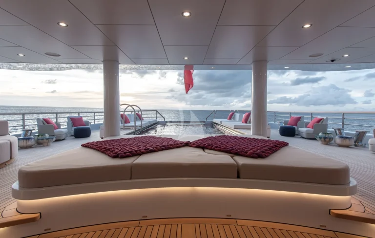 A signature feature of SYNTHESIS is her large aft deck pool with lounging areas around which combines with a very large main salon with bar and tv viewing areas, creating an exceptional flow of inside/outside areas.