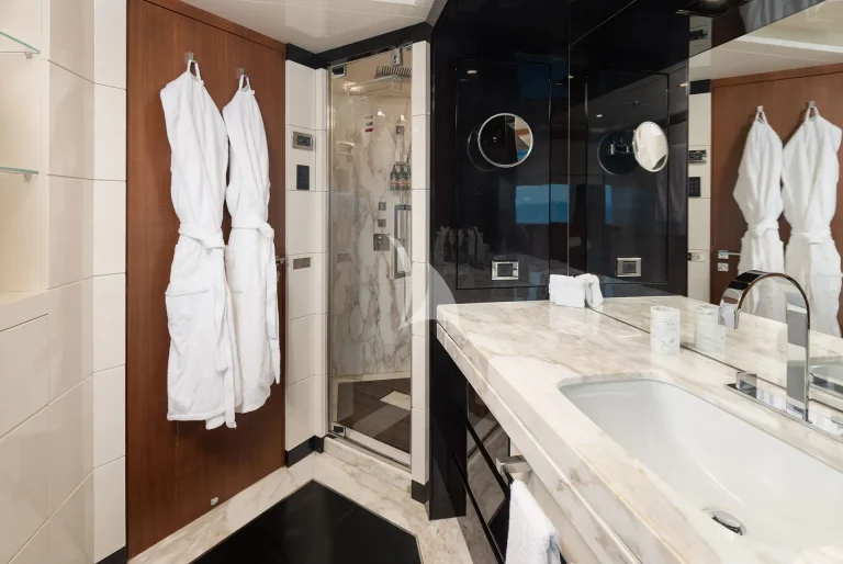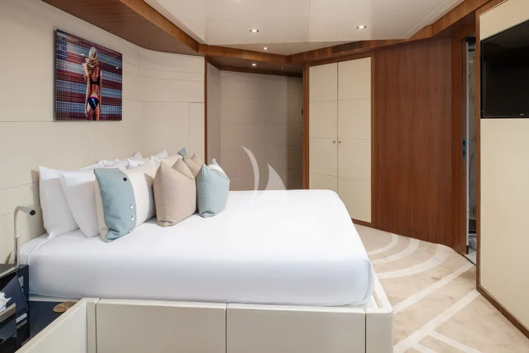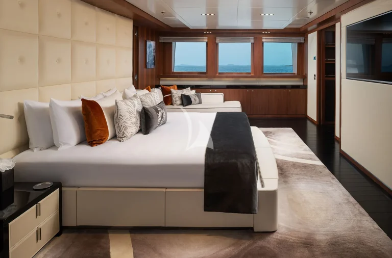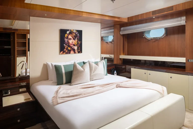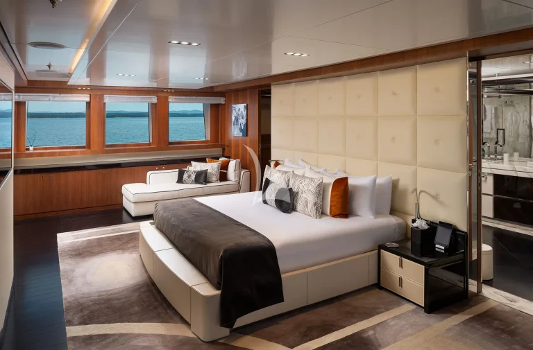 There’s accommodation for 12 guests in six cabins. The master suite and VIP both reside on the main deck, and the remaining cabins on the lower deck comprise two doubles and two twins (each with an additional Pullman bunk).