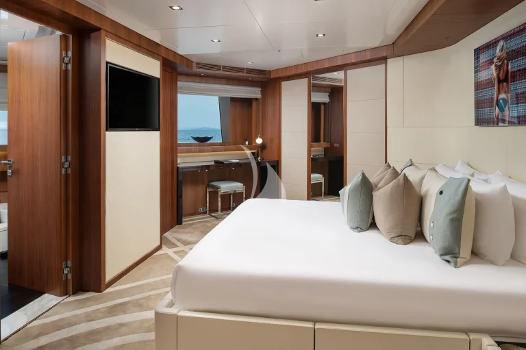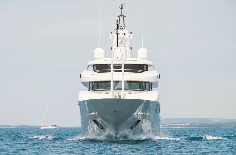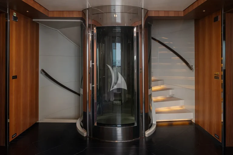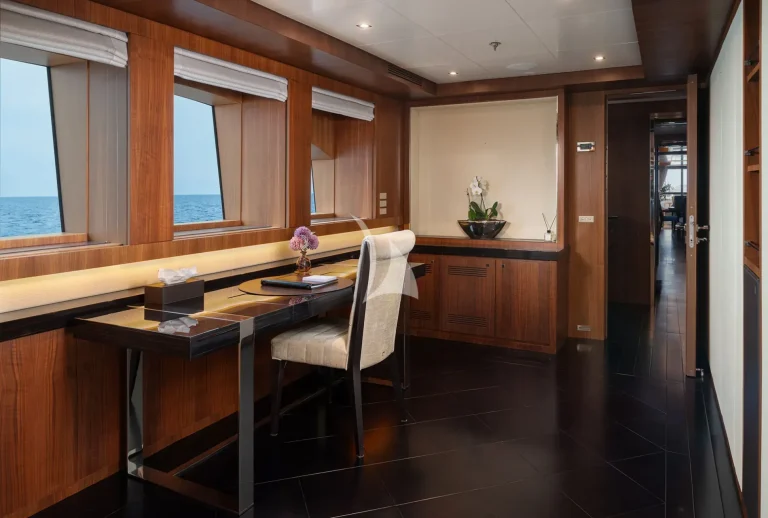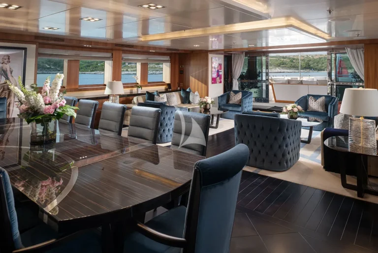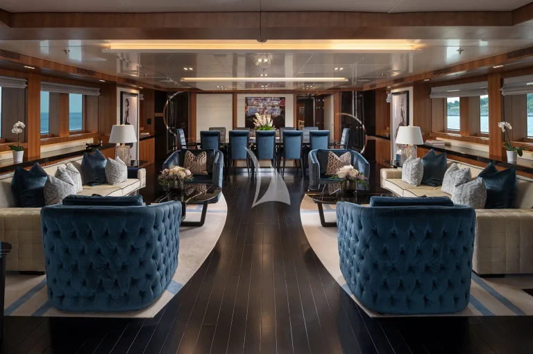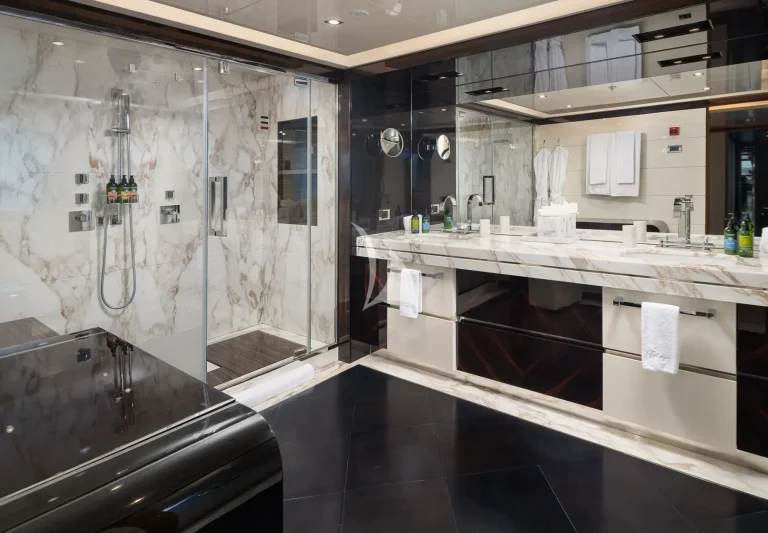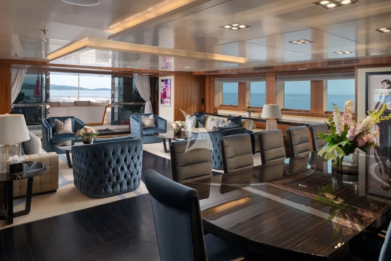 Other interior spaces and amenities include a skylounge with a 220-inch cinema screen, a well-equipped gym, and an extended swim platform at the boat’s stern with lowering steps to provide easy access to and from the water.