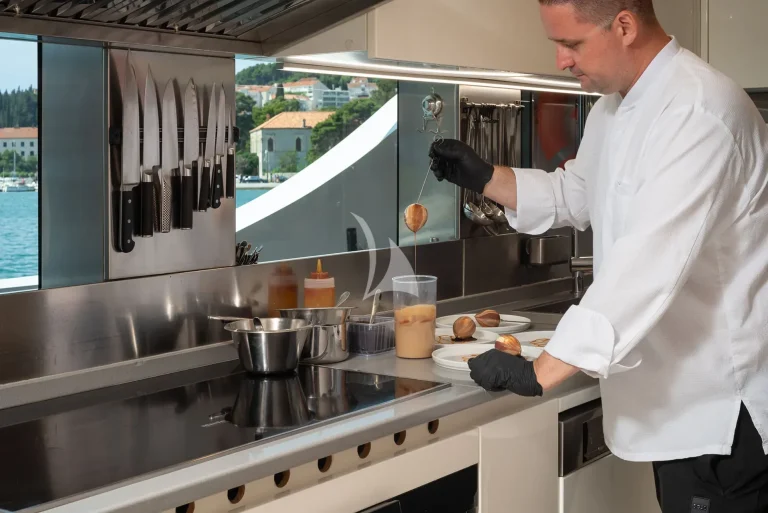 When it comes to dining, Chef Spiro has an excellent reputation. His culinary creations can be enjoyed at the main saloon’s dining table or to aft on the upper deck beneath the optional shade of the canopy.