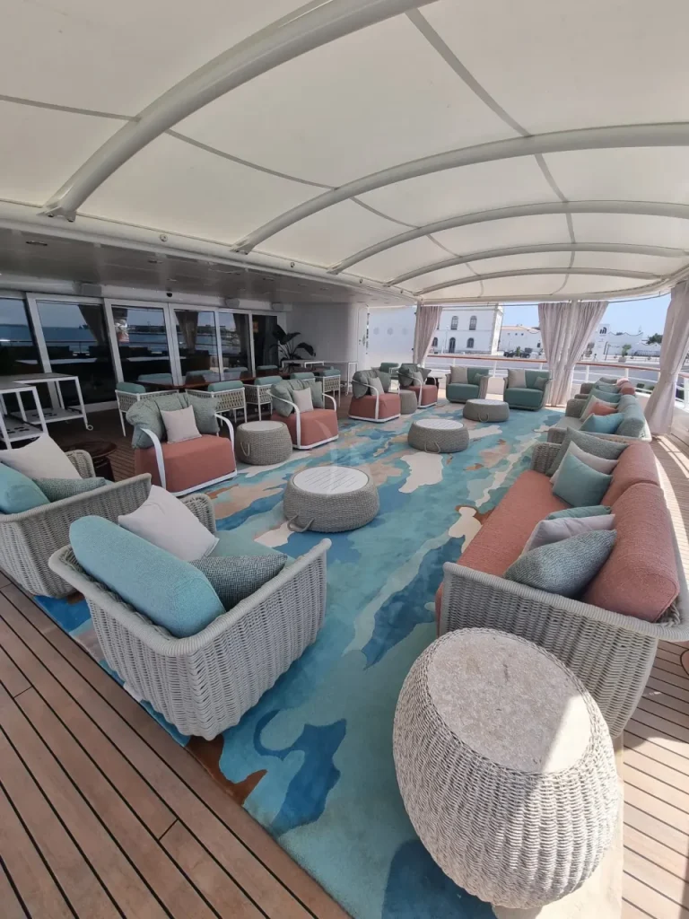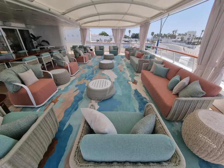 The main deck layout is concentrated around the 5m x 4m and 1.8m deep heated swimming pool with contra flow jets, with a lifting floor to allow an entirely flush aft deck. For safety, the pool’s entire perimeter is surrounded by removable stainless steel rails with glass panels.