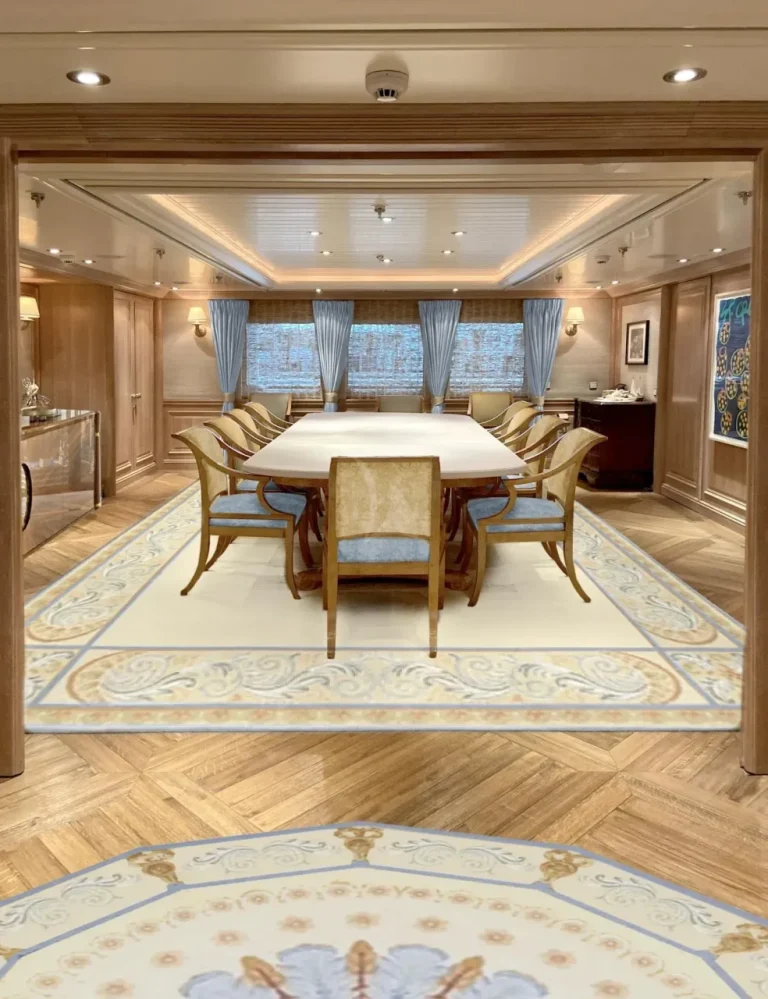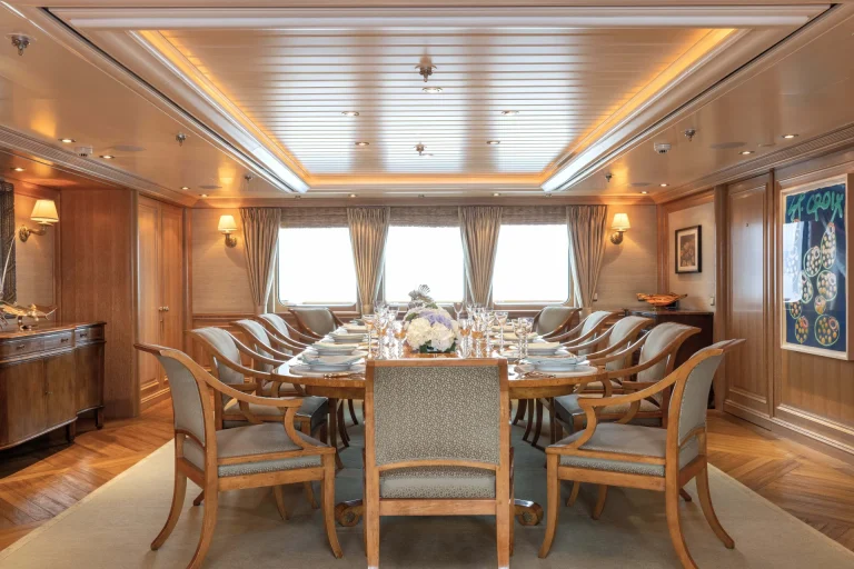 The main dining room is offset to port and private from the main foyer which connects the guest entertainment areas. It can seat comfortably up to 14 guests for dinner. The room can incorporate some of the main deck foyer area to accommodate larger parties. The elevator, which services all decks, is nearby.