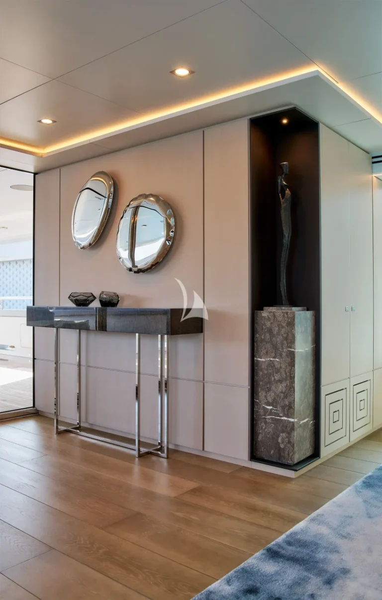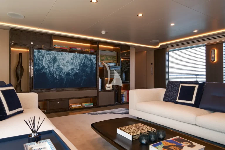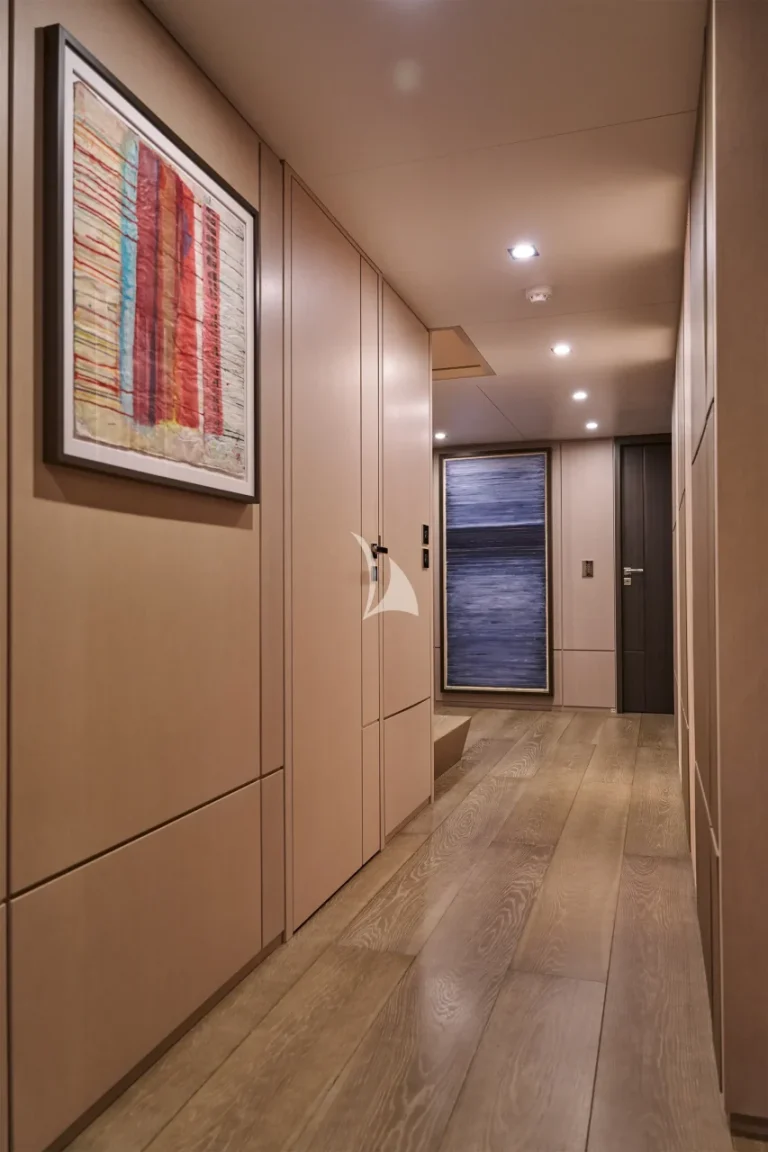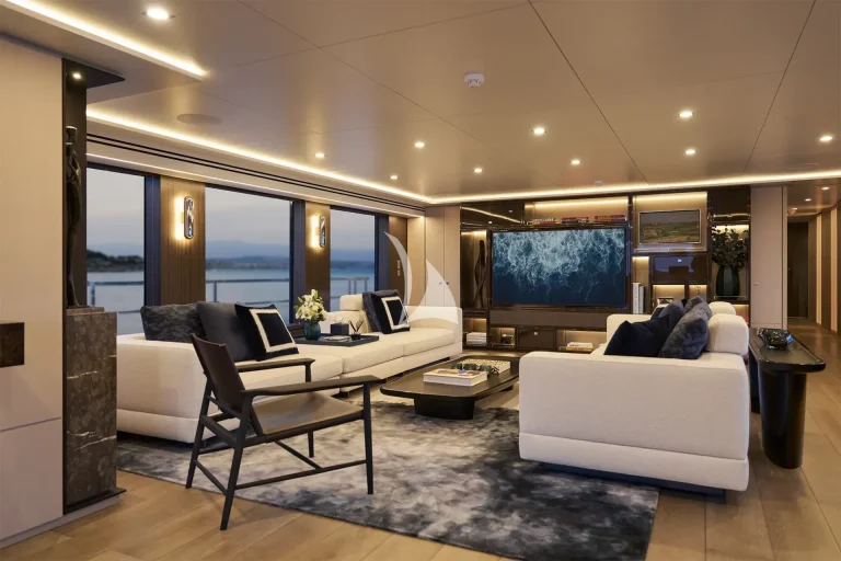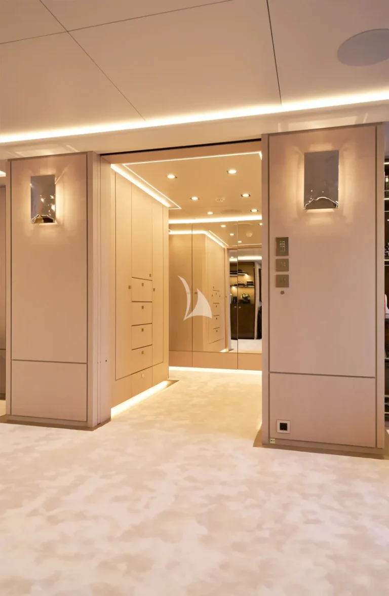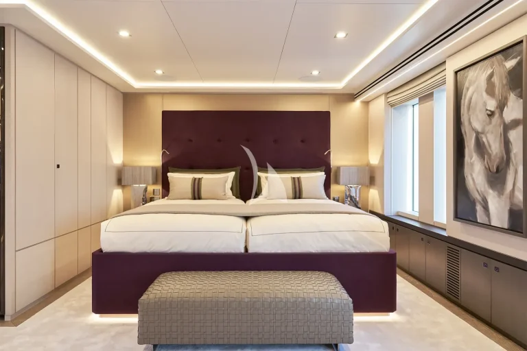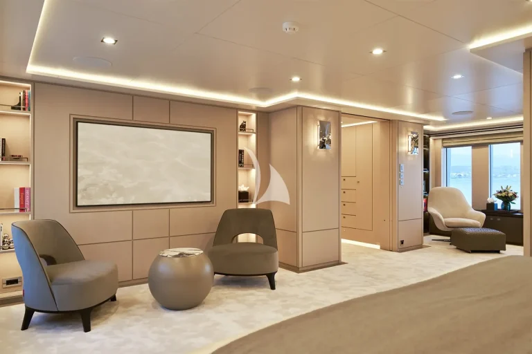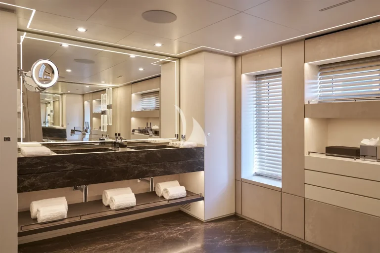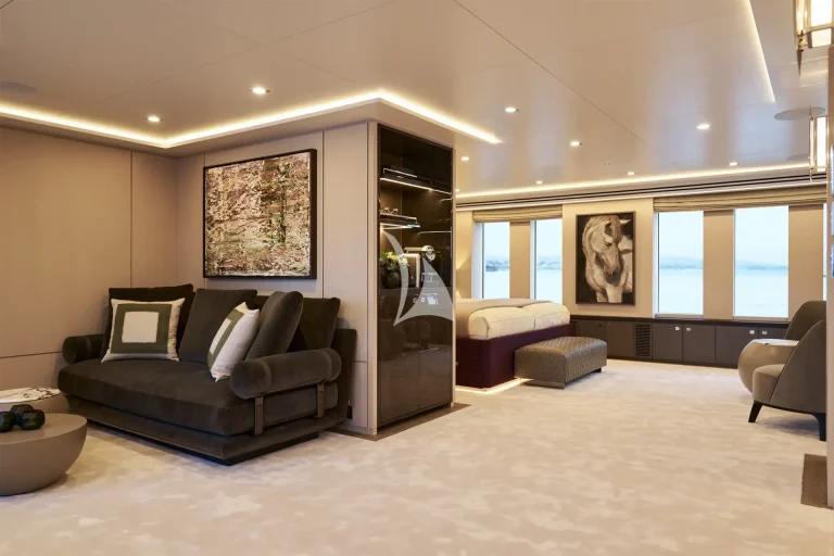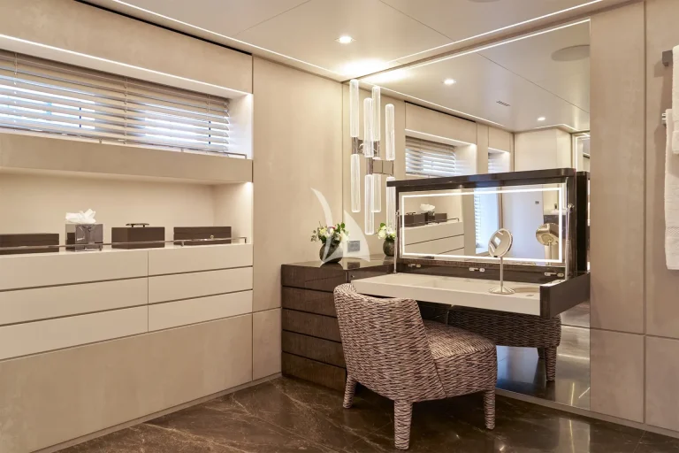 The yacht accommodates ten guests in five luxurious cabins and houses a crew of nine. Located on the main deck, THANUJA features a beautifully appointed 38 sqm Owner’s Suite, offering a smart separation between the sleeping area and a private lounge. This elegant space also includes a dedicated dressing room, a spacious bathroom, a separate toilet, and a connecting walk-in shower, designed to provide the ultimate in comfort and privacy.