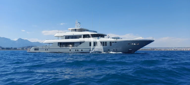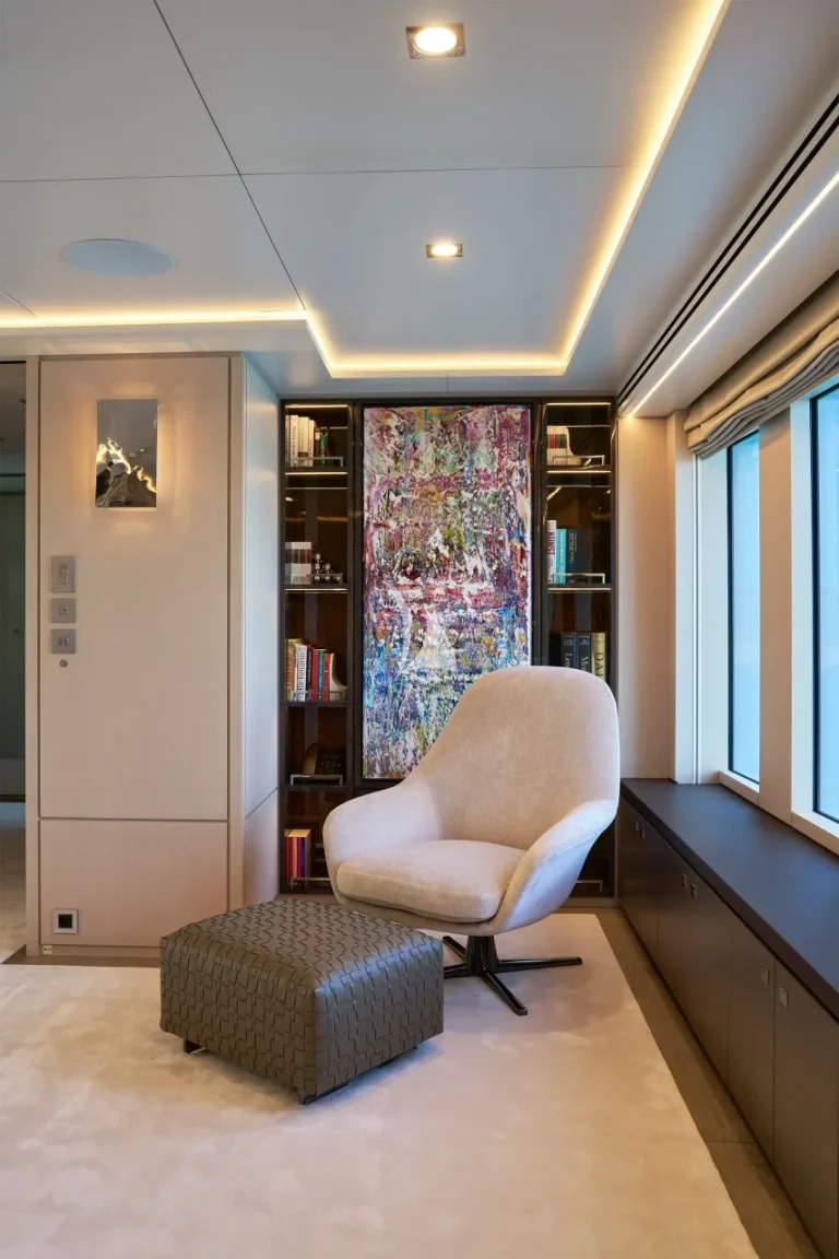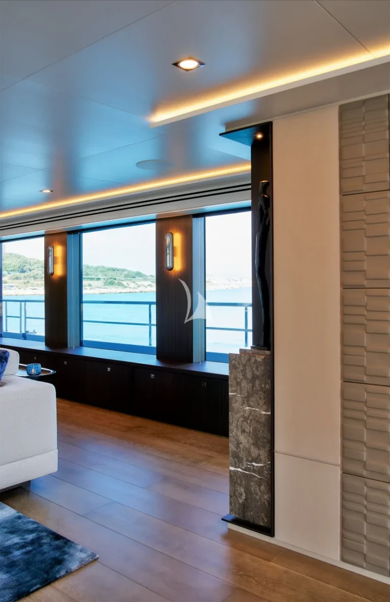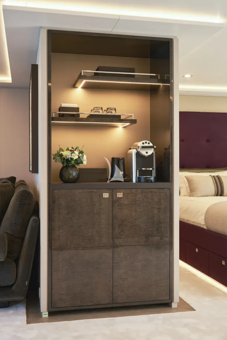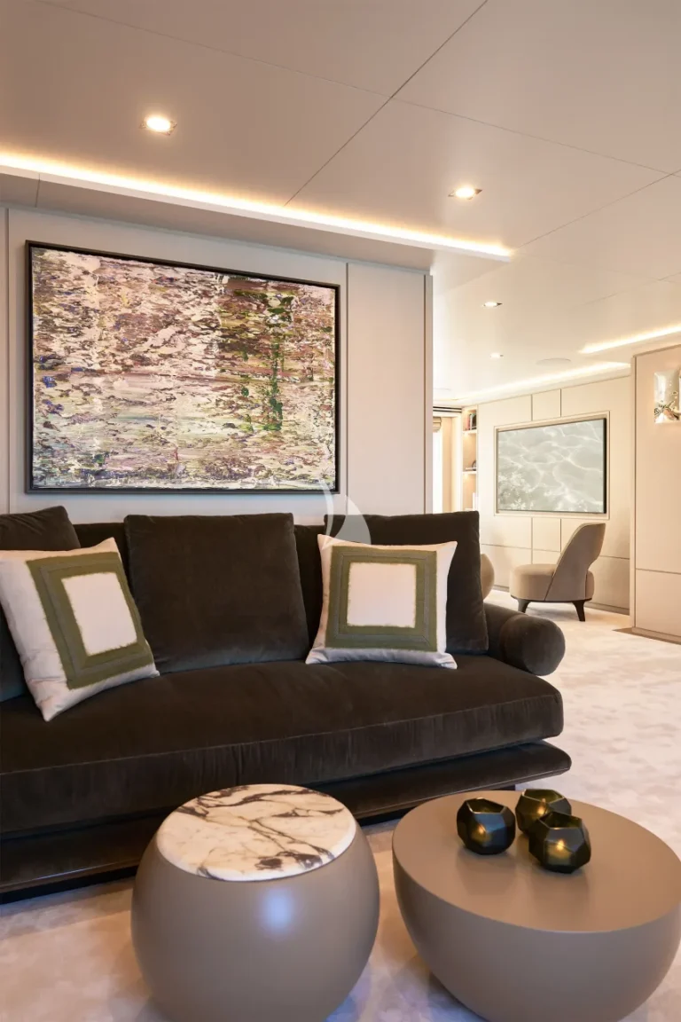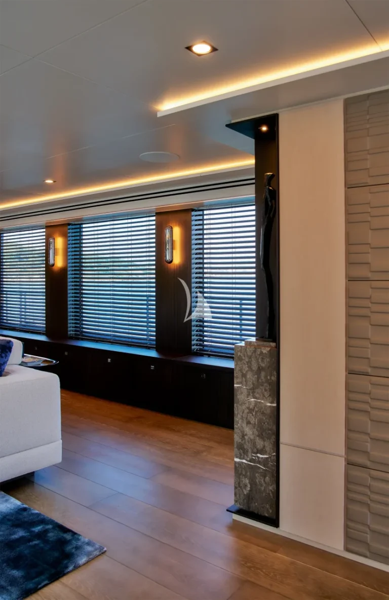 The yacht accommodates ten guests in five luxurious cabins and houses a crew of nine. Located on the main deck, THANUJA features a beautifully appointed 38 sqm Owner’s Suite, offering a smart separation between the sleeping area and a private lounge. This elegant space also includes a dedicated dressing room, a spacious bathroom, a separate toilet, and a connecting walk-in shower, designed to provide the ultimate in comfort and privacy.