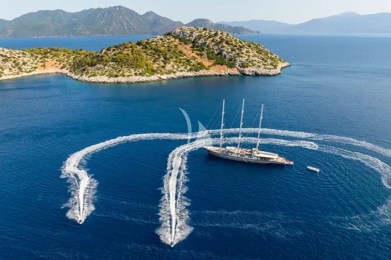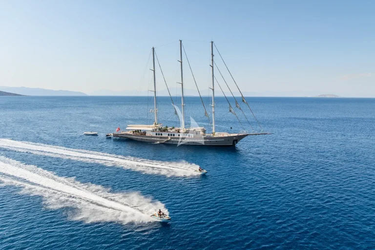 At sea level, the yacht’s expansive beach club and submersible platform offer seamless access to the water. THE LANGLEY carries a wide selection of water toys, including jet skis, Seabobs, paddleboards, wakeboards, and towables — ensuring fun for guests of all ages. A stylish tender supports smooth transfers and coastal exploration.