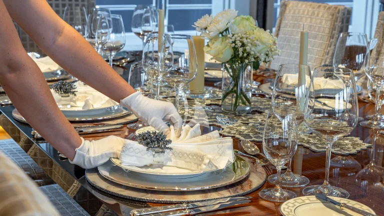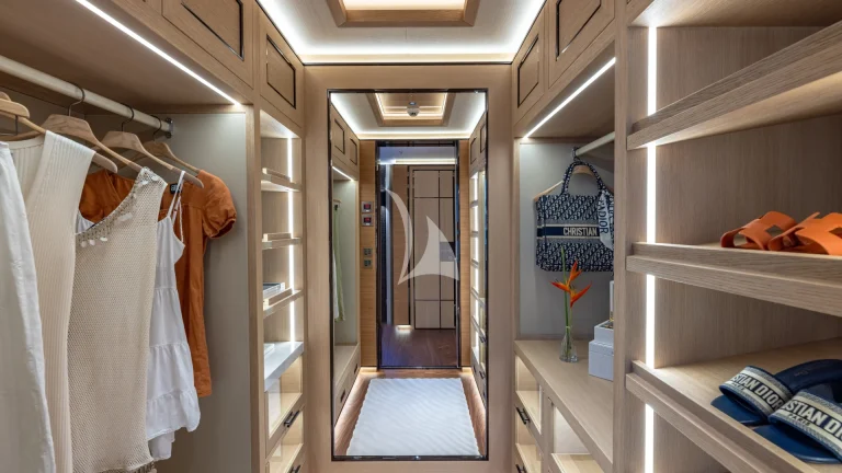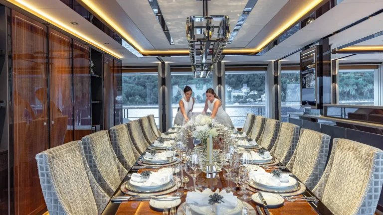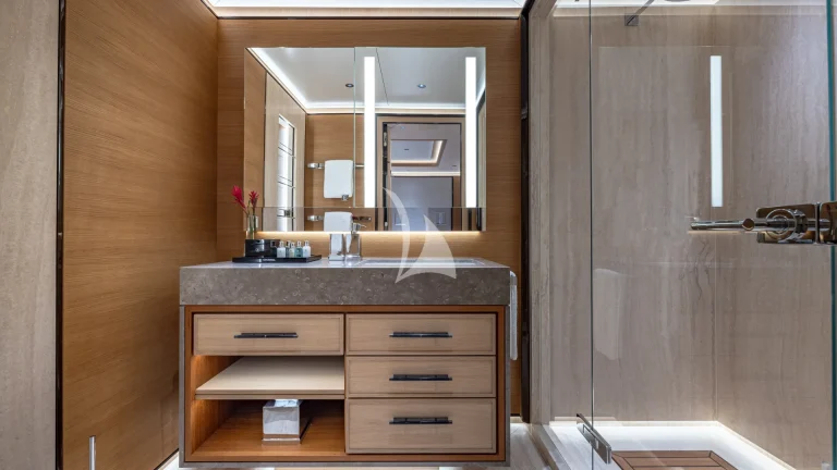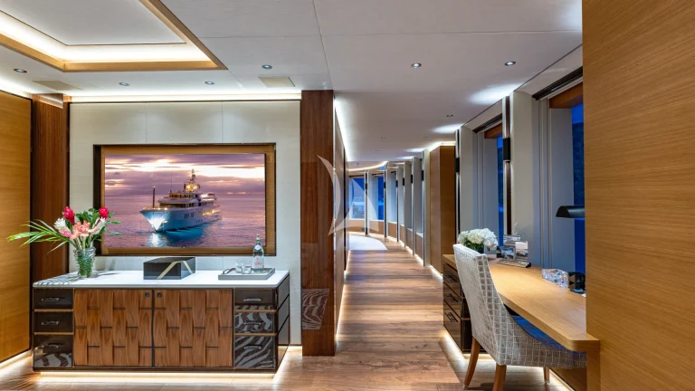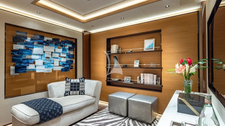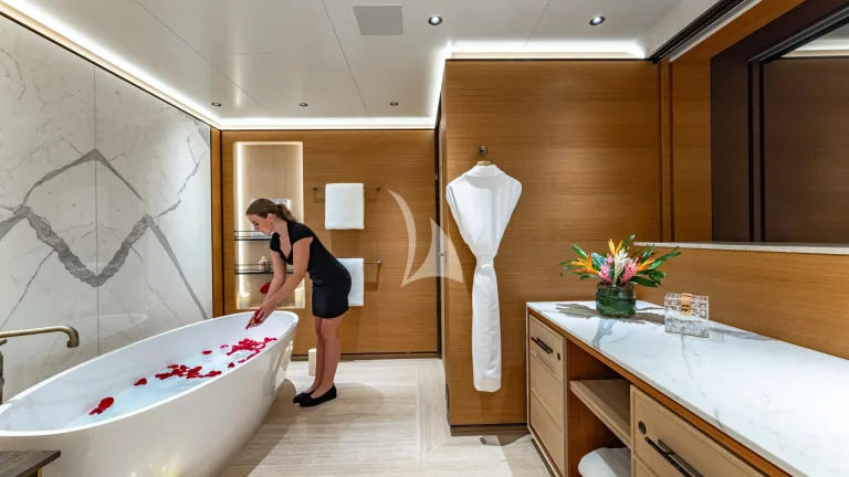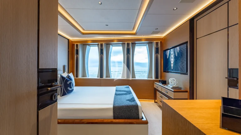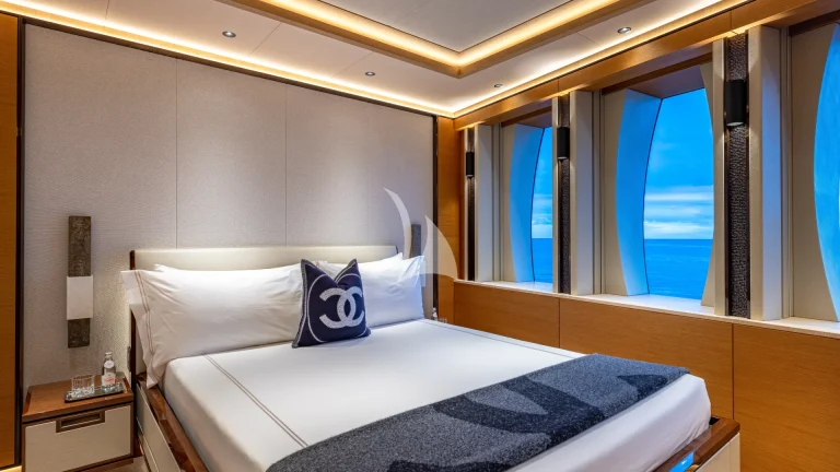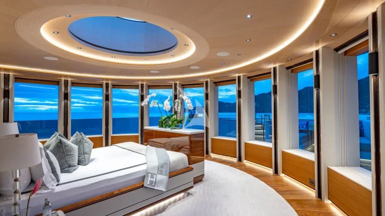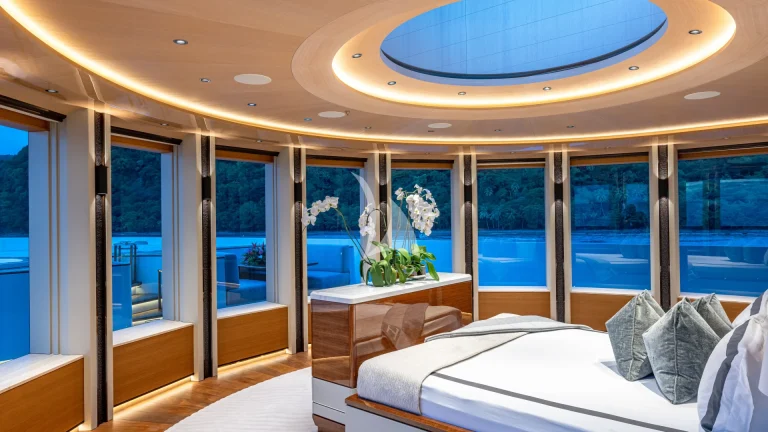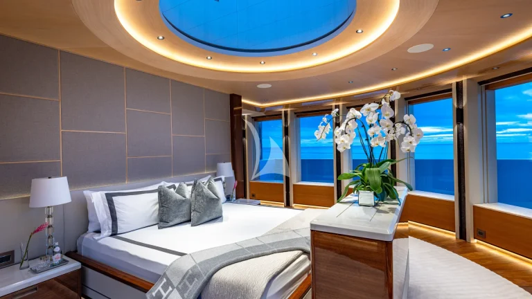 The Royal Hakvoort living spaces were designed with entertaining in mind. Formal dining areas are featured throughout the yacht. The galley is an open, socially-oriented space, that is also properly adapted for the onboard chef. A glass elevator reaches all decks onboard, transporting guests to any of the 5 decks. The dedicated owner’s deck features a private dining area and a foredeck jacuzzi for privacy and relaxation. The large king bed is surrounded by 180-degree floor-to-ceiling windows allowing sunlight to illuminate the suite. Additional guest rooms offer convertible spaces to fit any combination of families, friends, or corporate charters. Each stateroom features large windows, providing a stunning view from every angle. One stateroom is wheelchair accessible.