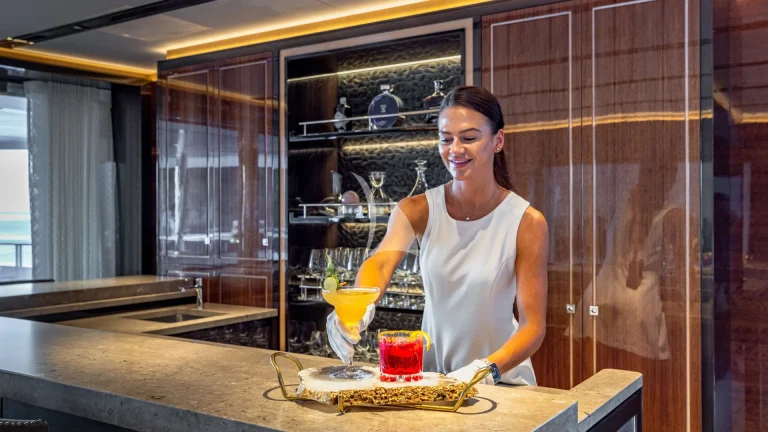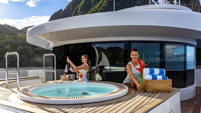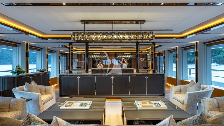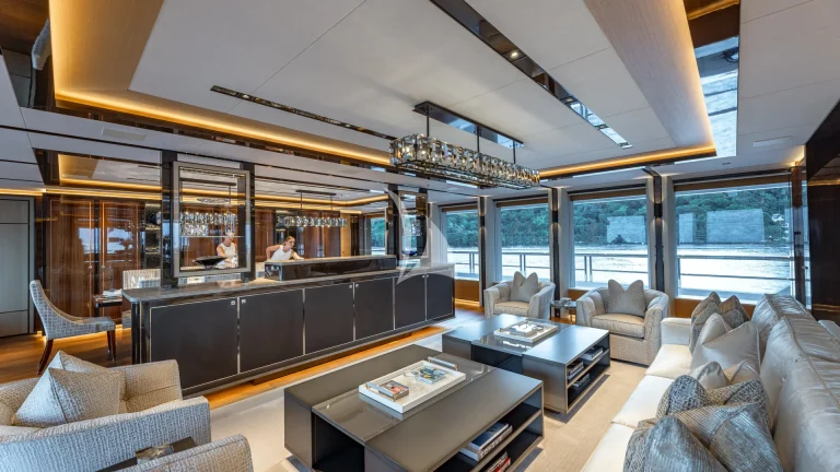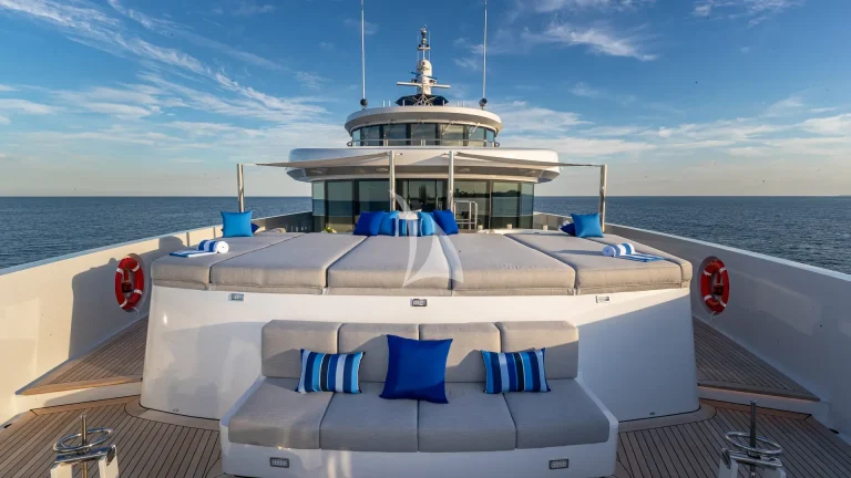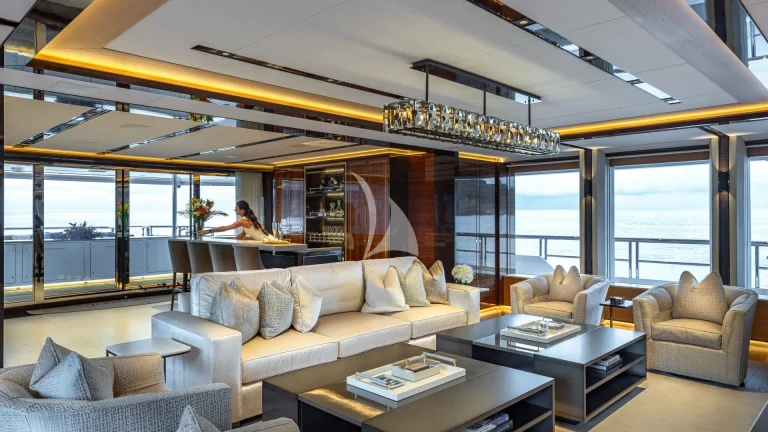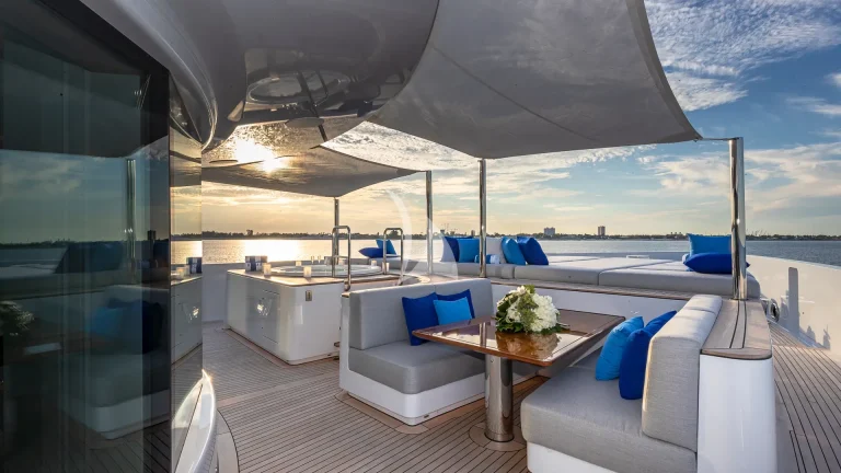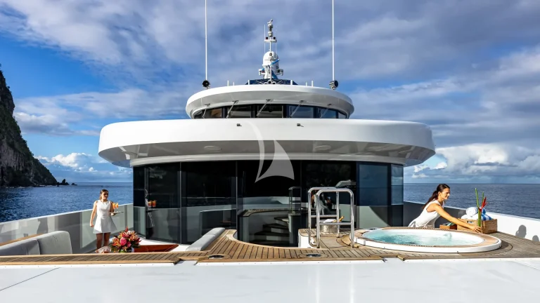 The luxury superyacht hosts several standout features including a cinema room, loaded beach club that doubles as an onboard gym, large tender and toy garage, upper deck swimming pool, outdoor kitchen, and firepit on the sundeck. The air-conditioned sundeck features an array of outdoor seating. The large swimming pool provides the perfect ocean view. Just steps from the pool, a fully-stocked bar will be waiting to serve you an ice-cold beverage. For those who prefer the heat, a steamy jacuzzi is located on the bow and spa services are offered by the multi talented crew.