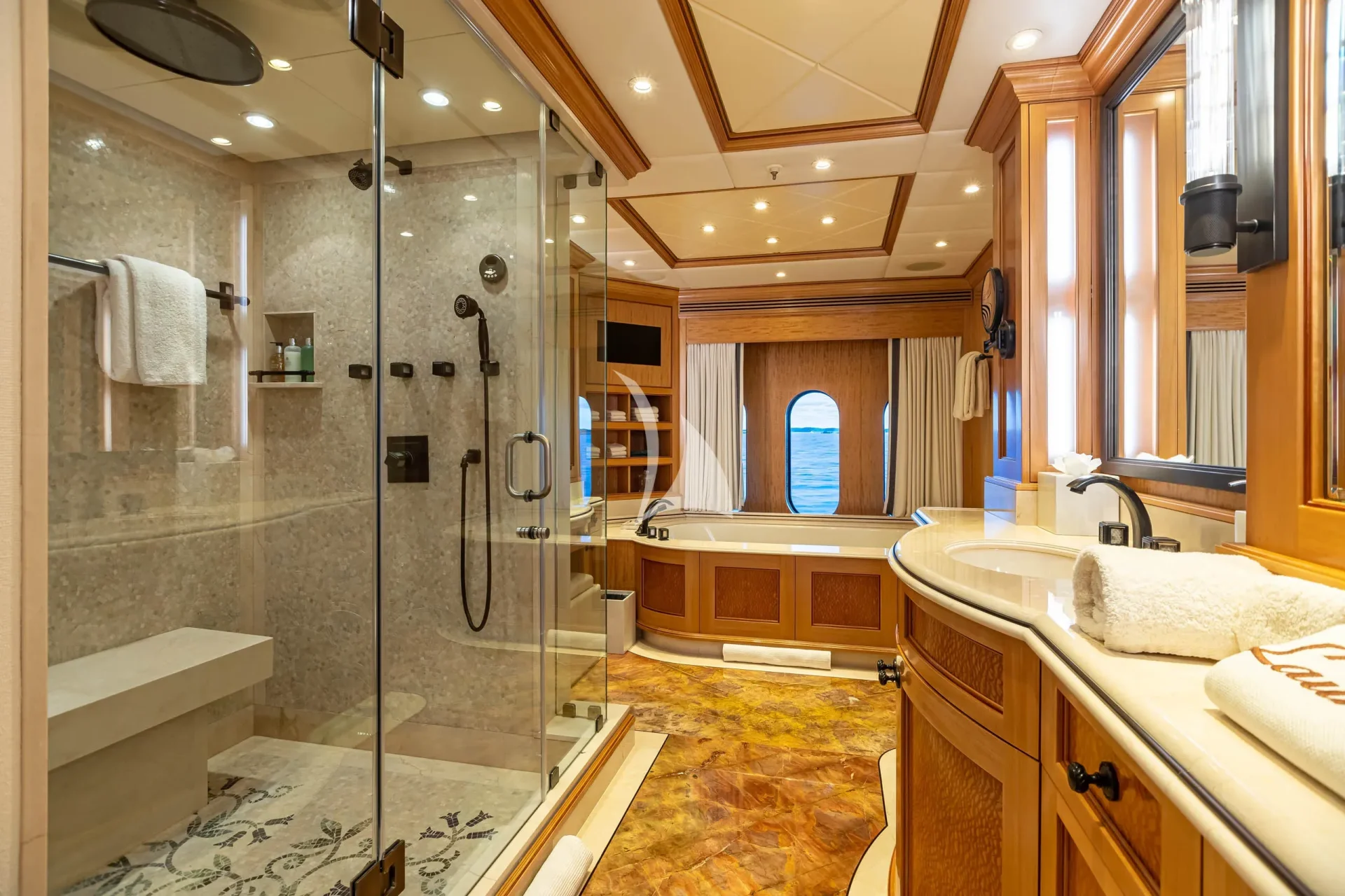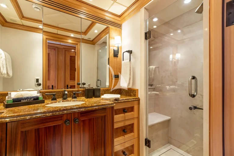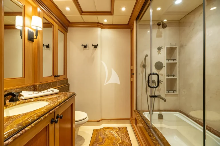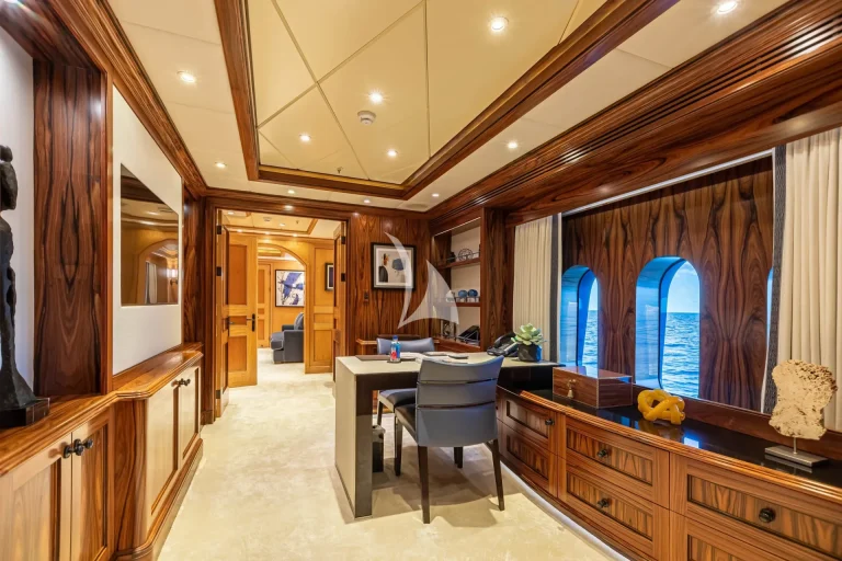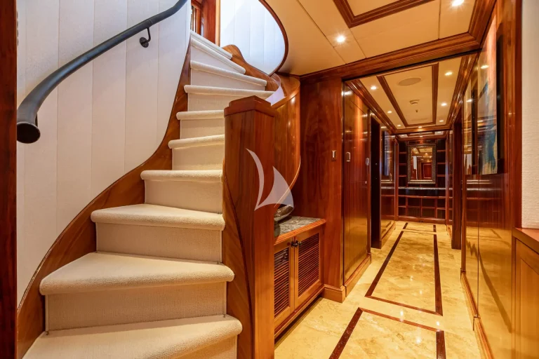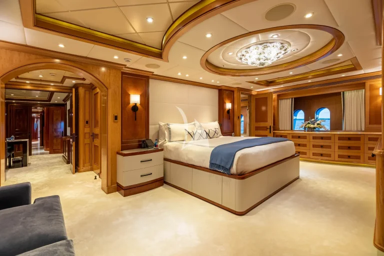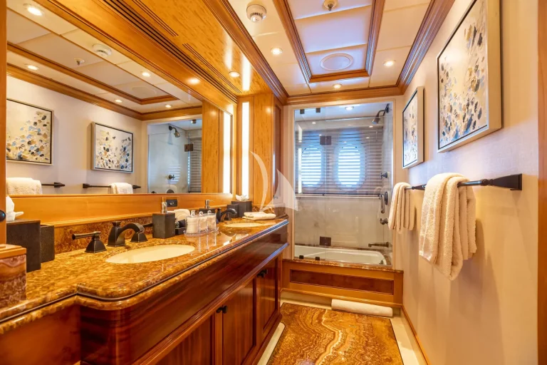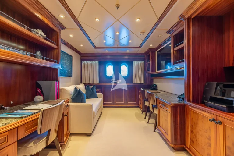 Her elegant main saloon leads into a separate formal dining area, and her expansive sky lounge features a bar, lounge area and game tables. Al fresco dining is available on the bridge deck aft along with a large seating area. Her large sun deck offers an array of areas for entertainment and relaxation with sun-pads, a bar, exercise equipment and an oversized jacuzzi.
