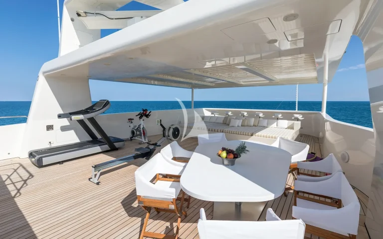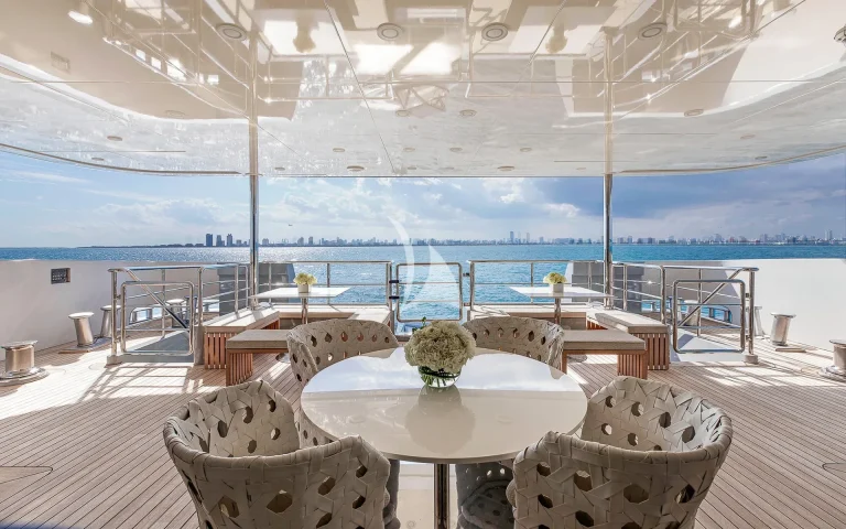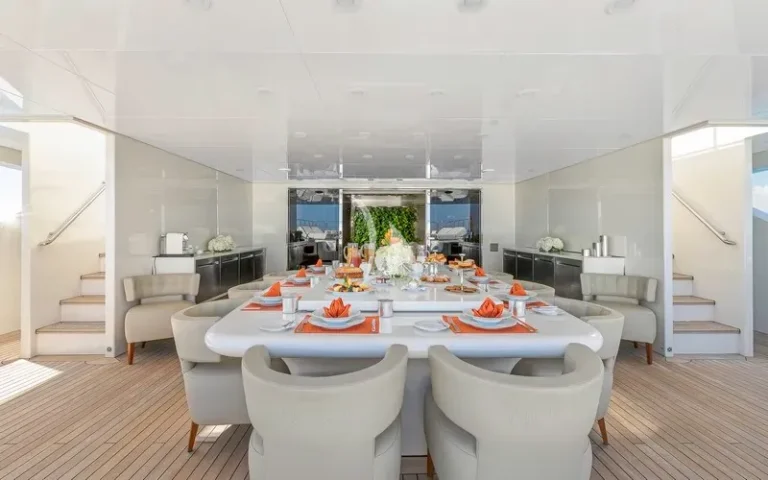 The large dining table on the heli deck comfortably seats up to 12 guests and is suitable for both alfresco meals and formal dining.