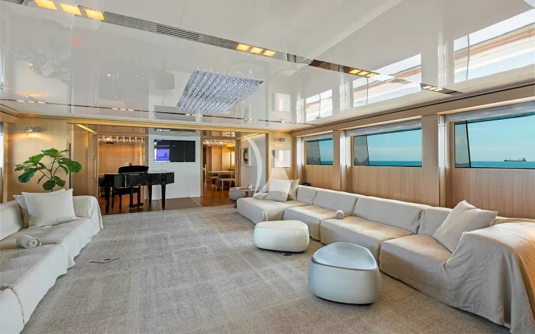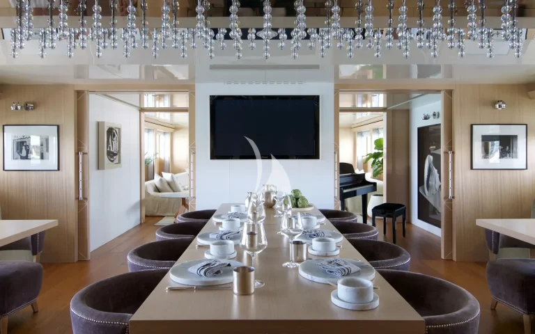Her main salon with elegant sofas in creamy white leather as well as her bar and indoor dining area for smaller groups offer an uncluttered warm welcome to guests.