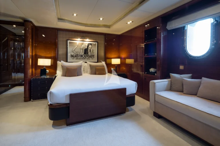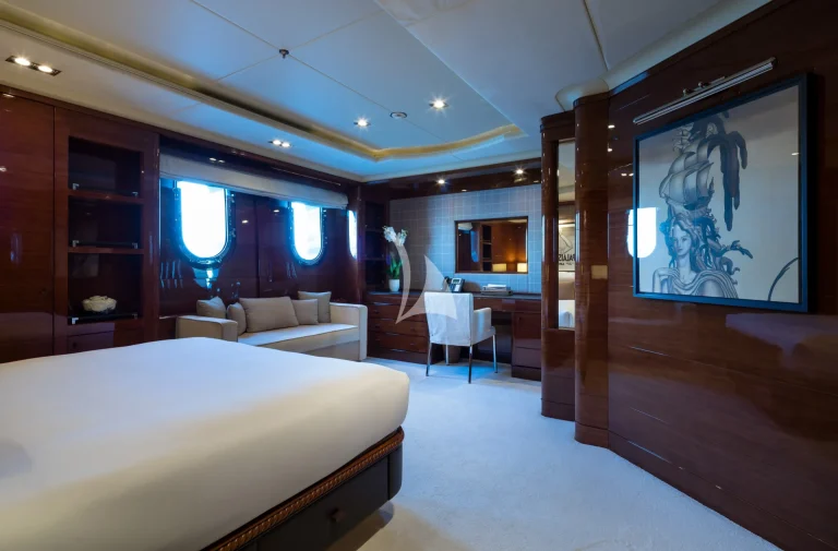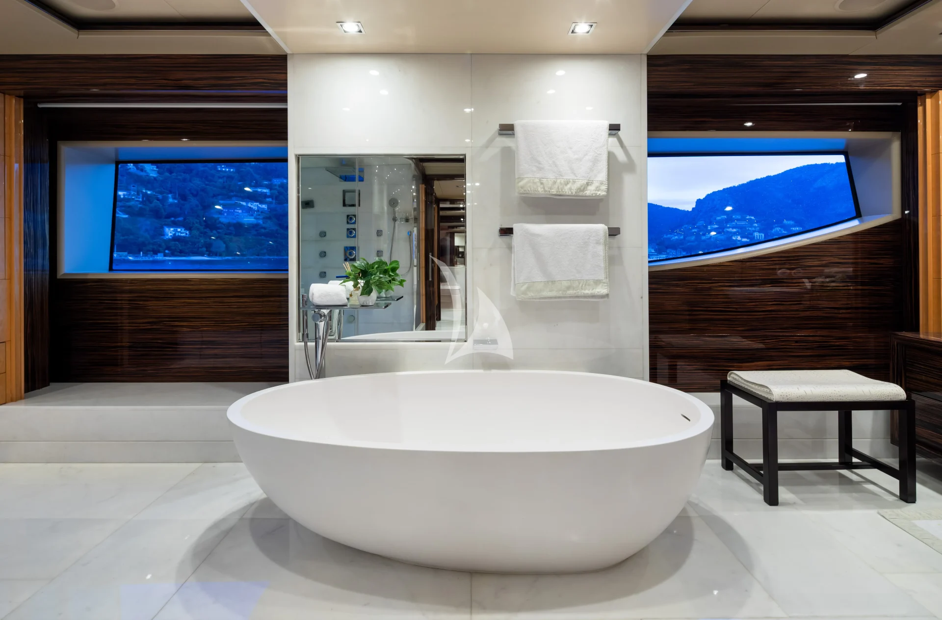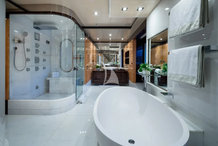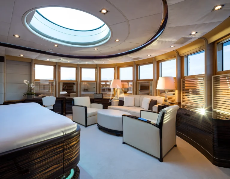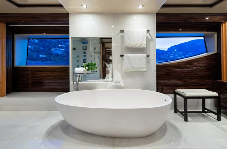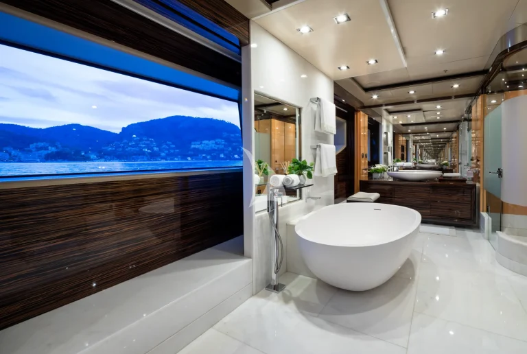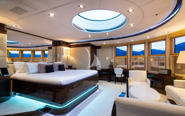 VISION sleeps up to 12 guests in six beautifully appointed cabins that prioritize space, privacy, and calm. The standout is a split-level master suite that is more akin to a private residence than a typical stateroom, complete with a lounge area, office, and dual walk-in wardrobes. A sliding partition allows for flexible use of the space, while the bed is positioned beneath an oversized skylight that floods the room with natural light. The en suite bathroom is equally indulgent, with his-and-hers vanities, a freestanding tub, and a separate rainfall shower.